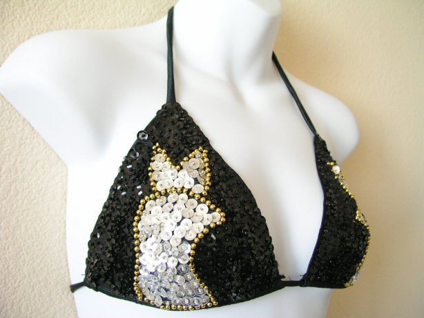 Embroidered Sequins Clubbing Bra Top & Thong Bikini Swimsuit / Swimwear - S & M