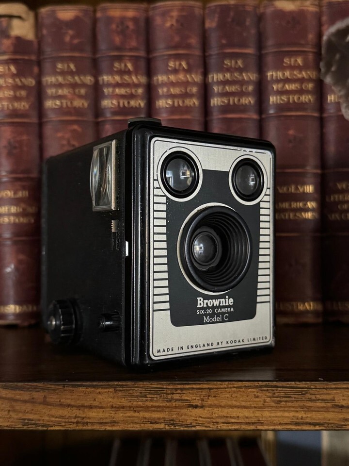 . A classic mid-20th-century box camera, the Brownie series helped popularize photography for everyday households and remains one of the most recognizable camera designs ever produced.
