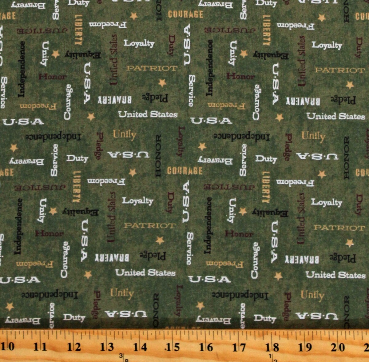 Cotton All American Patriotic Words USA Army Green Fabric Print by Yard D387.37