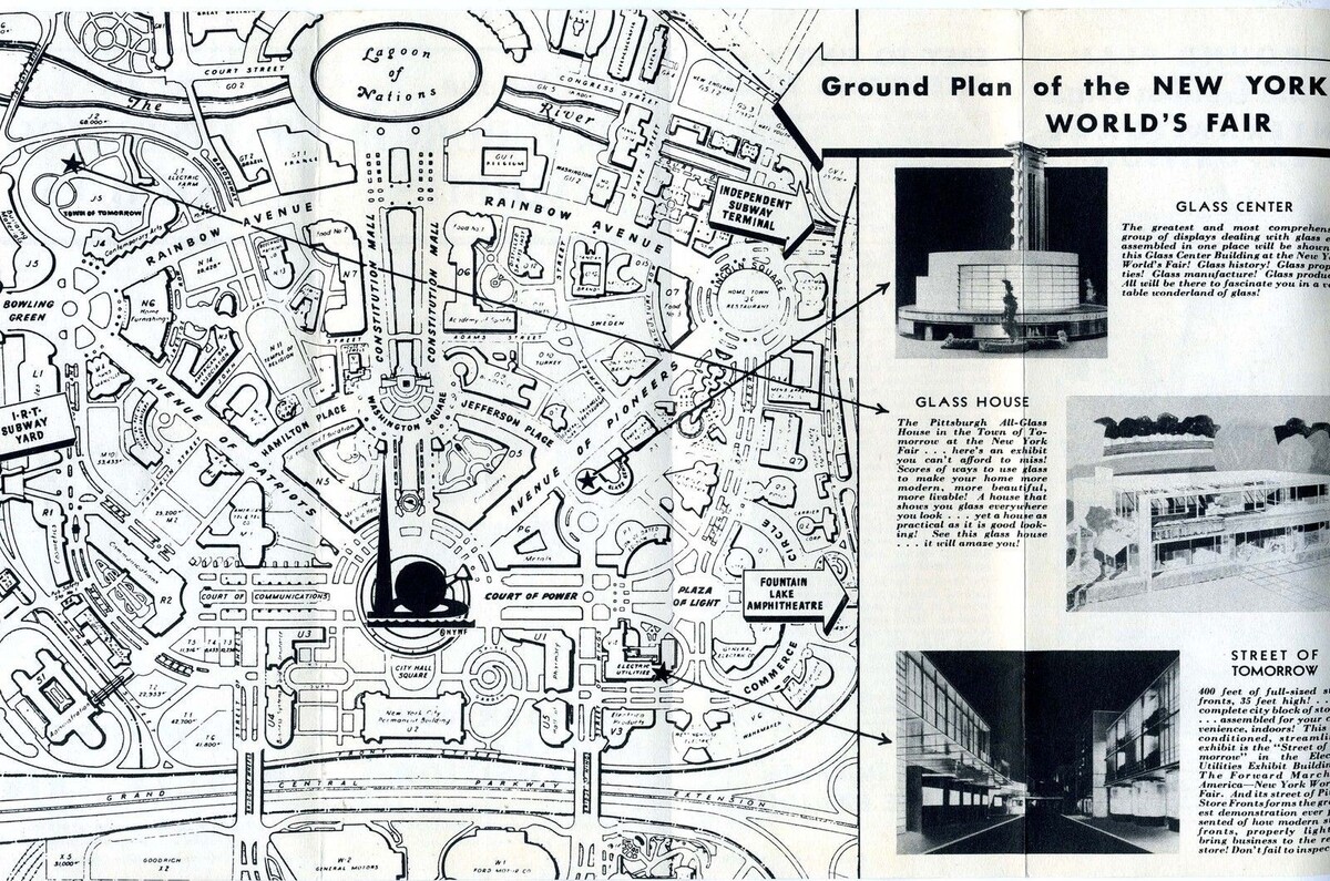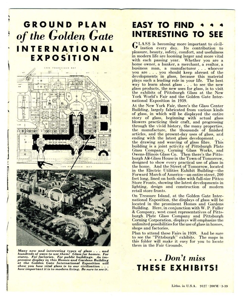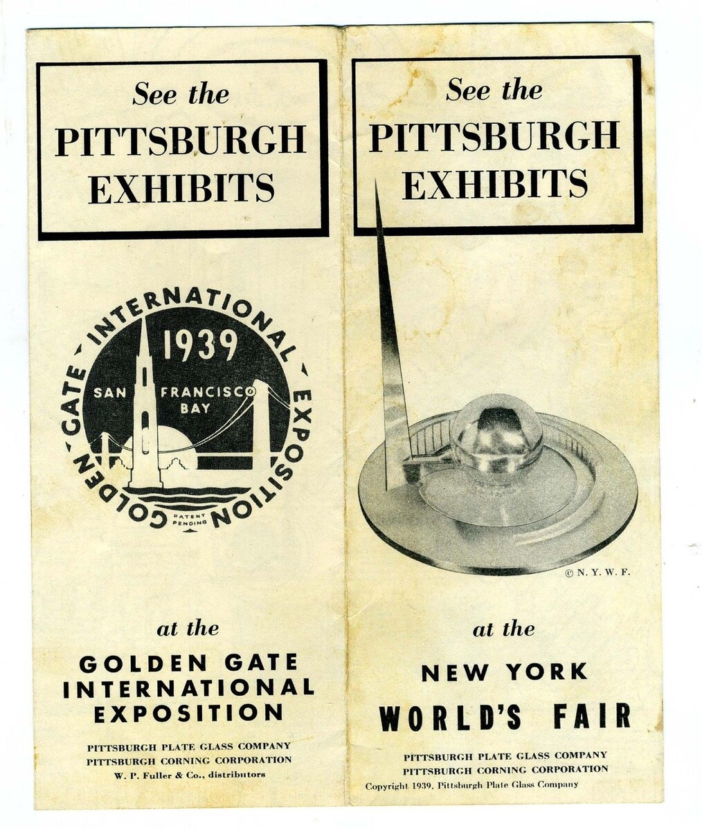 An 8 panel fold out 1939 Pittsburgh Exhibits Brochure. On one side is a map and information on the 1939 New York Worlds Fair and on the other side is a map and information on the Golden Gate International Exposition in San Francisco, California. Published by the Pittsburgh Plate Glass Company and the Pittsburgh Corning Corporation to describe their exhibits at these shows.