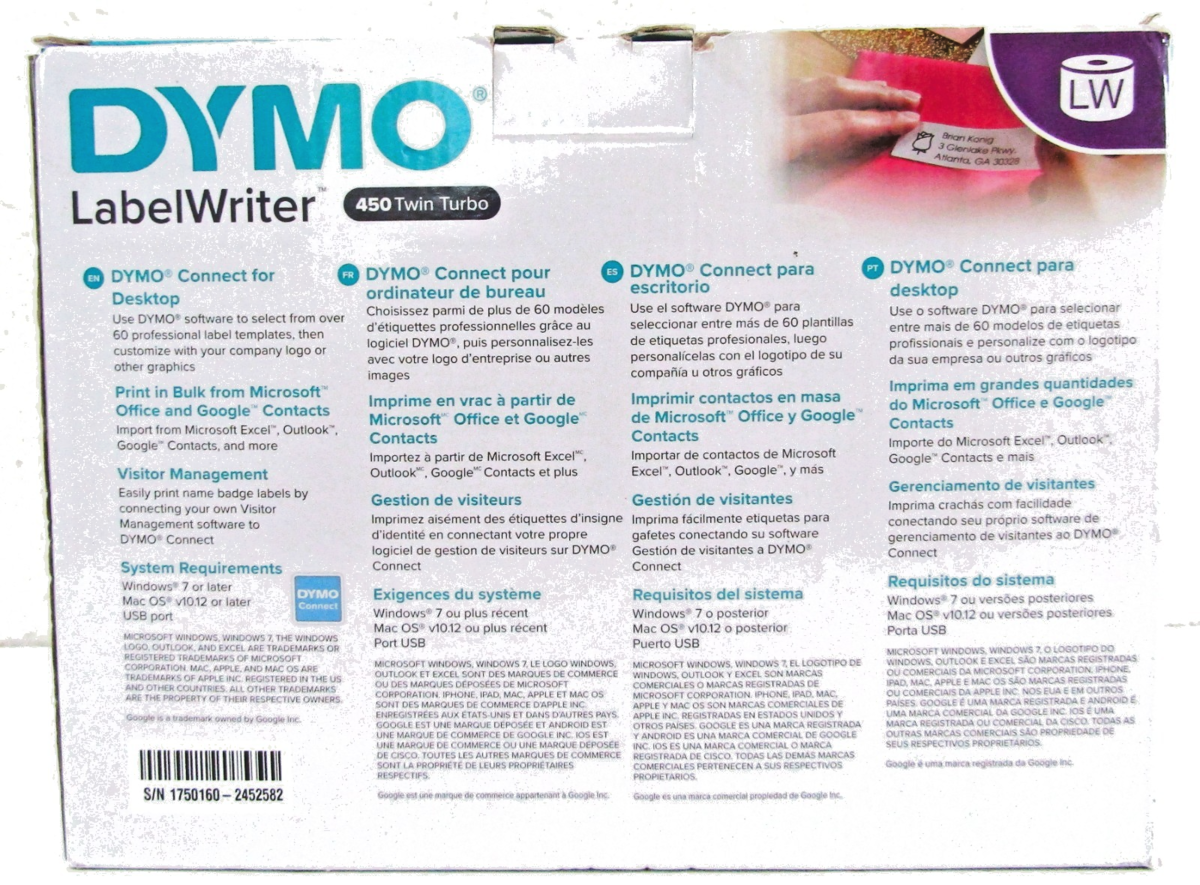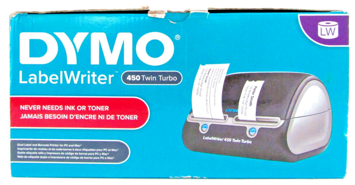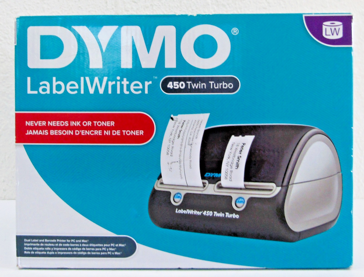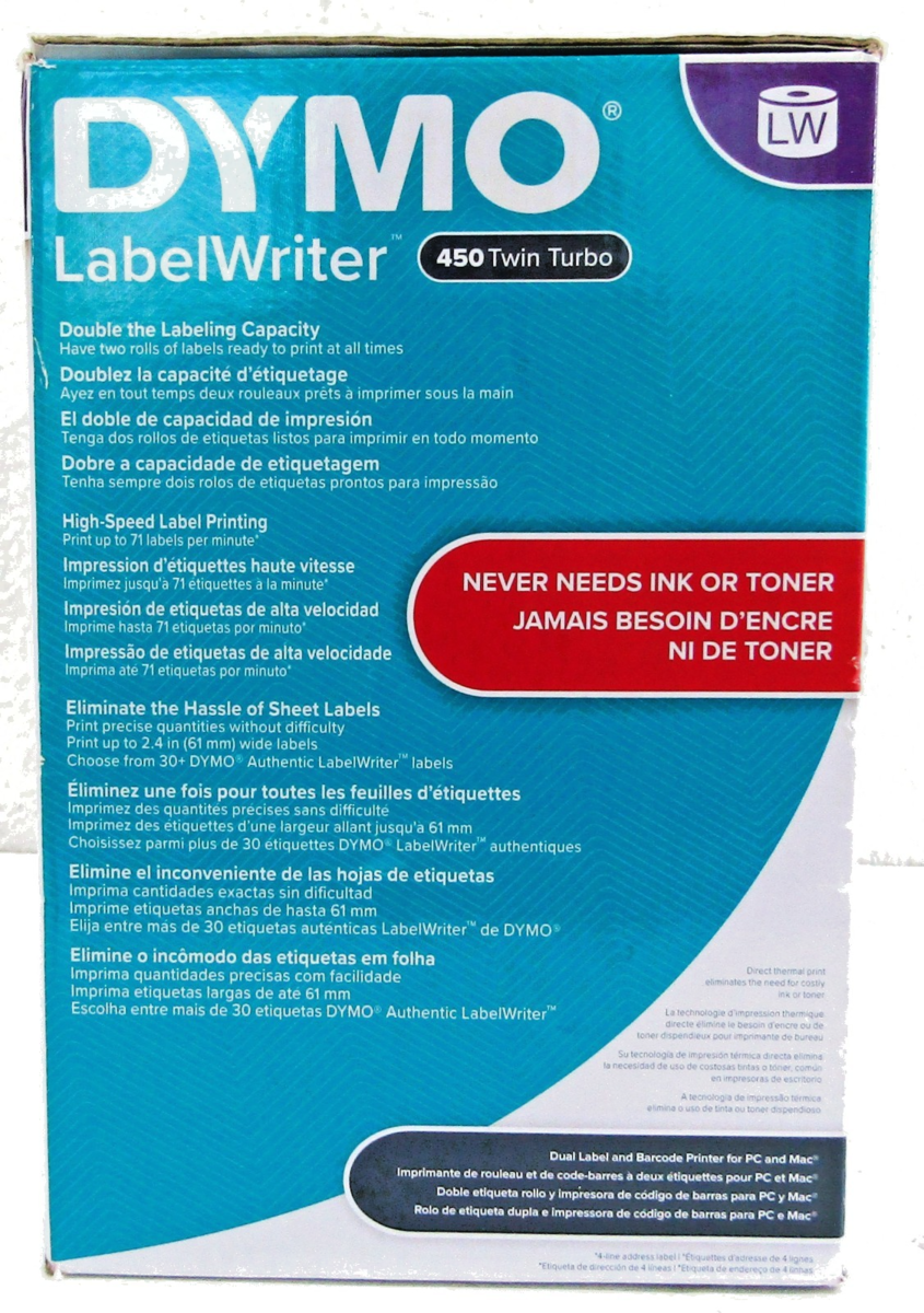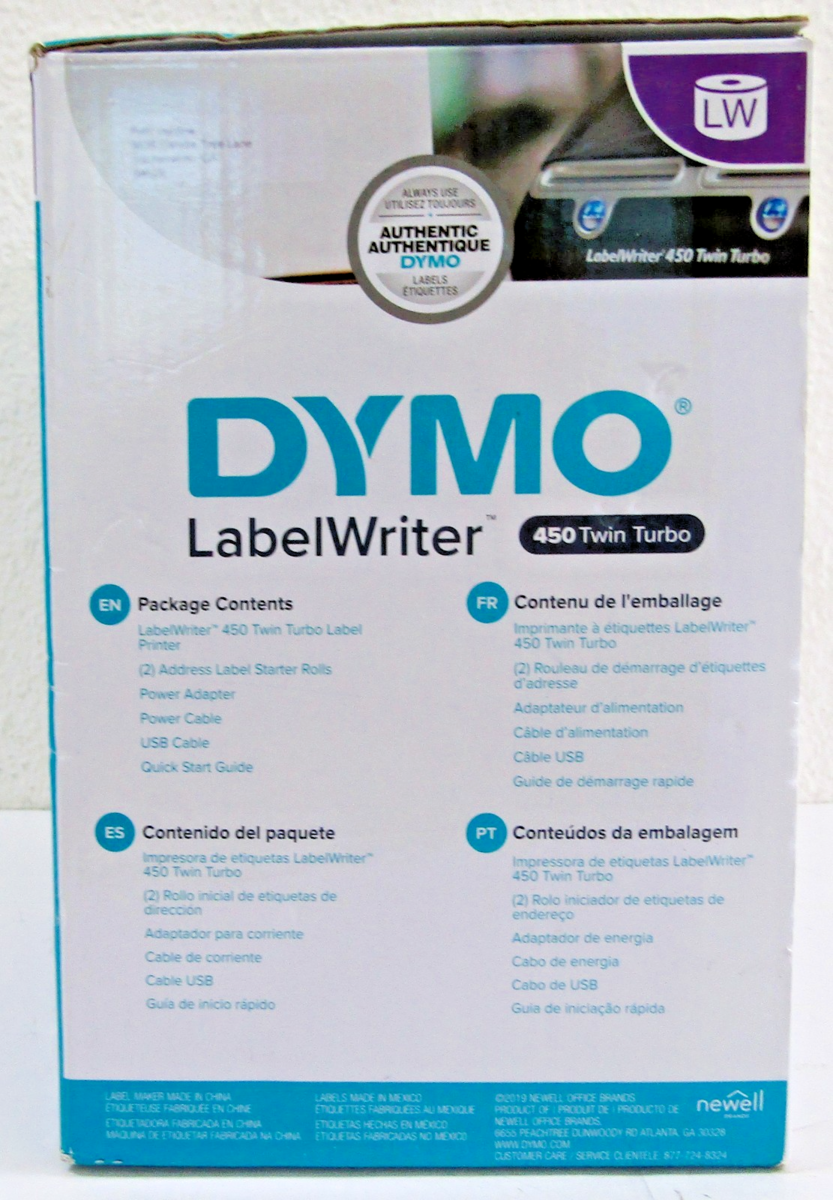 The DYMO LabelWriter 450 Twin Turbo features two rolls of labels ready to print at all times - enhancing efficiency by allowing you to print address labels and postage without swapping label rolls - and prints up to 71 four-line standard address labels per minute for maximum productivity. Create and print address, shipping, file folder, and barcode labels, plus name badges, and more - all without the extra work and hassle of printing sheet labels on a standard desktop printer. *Compatible with Windows 7 or later and Mac OS X v10.8 or later. Microsoft and Windows are either registered trademarks or trademarks of Microsoft Corporation in the United States and/or other countries. Mac and OS X are trademarks of Apple Inc., registered in the U.S. and other countries.