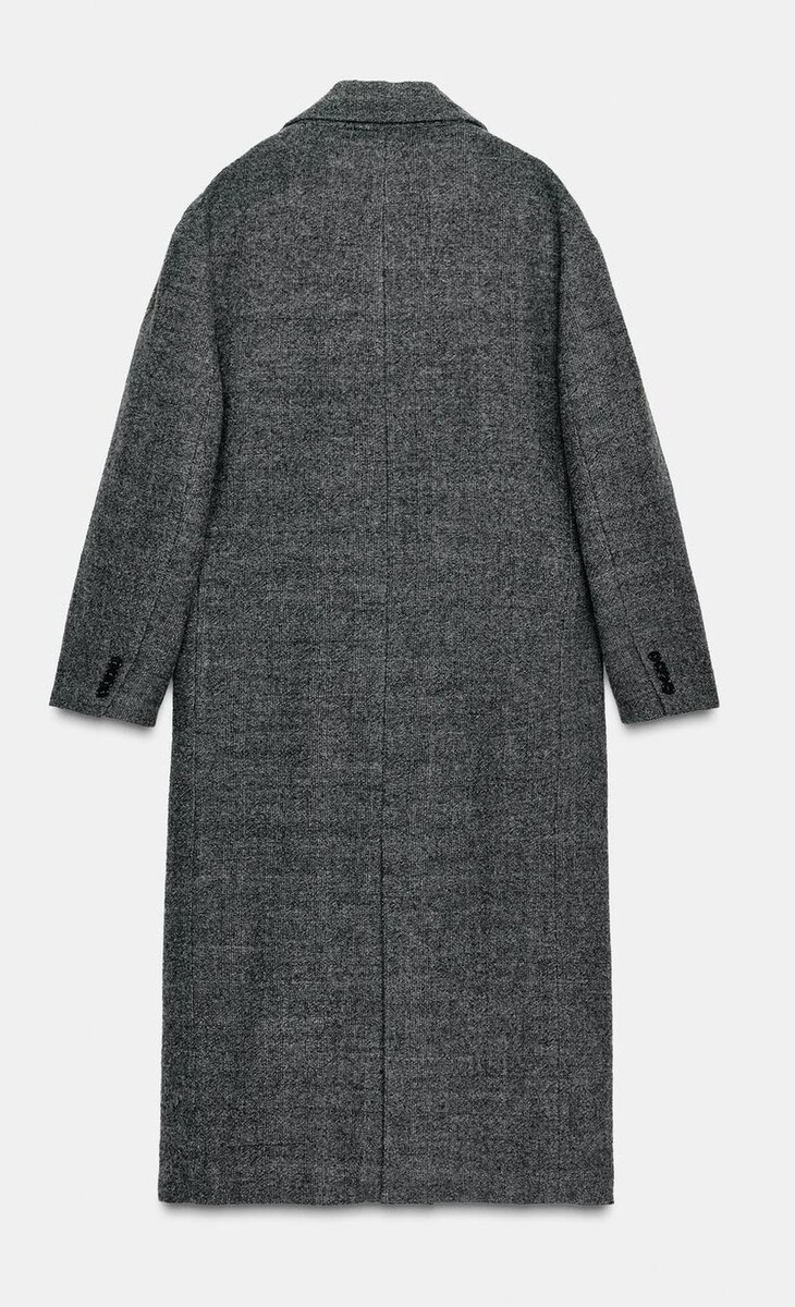 Oversized coat with main fabric made of 100% wool yarn. Lapel collar and long sleeves with openings and buttons. Front flap pockets. Front double-breasted button closure.