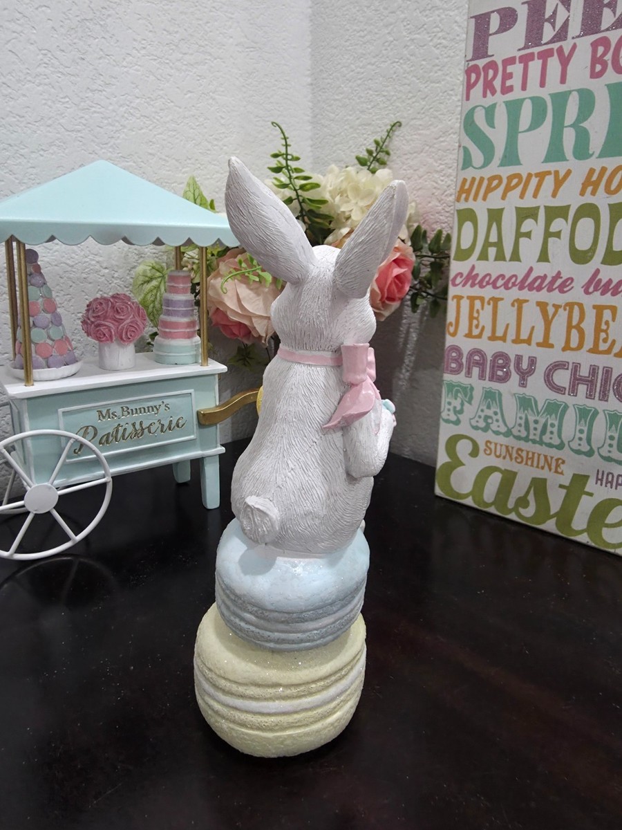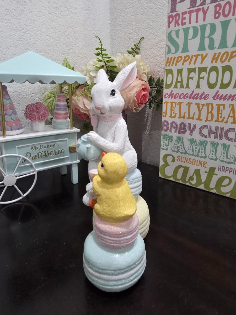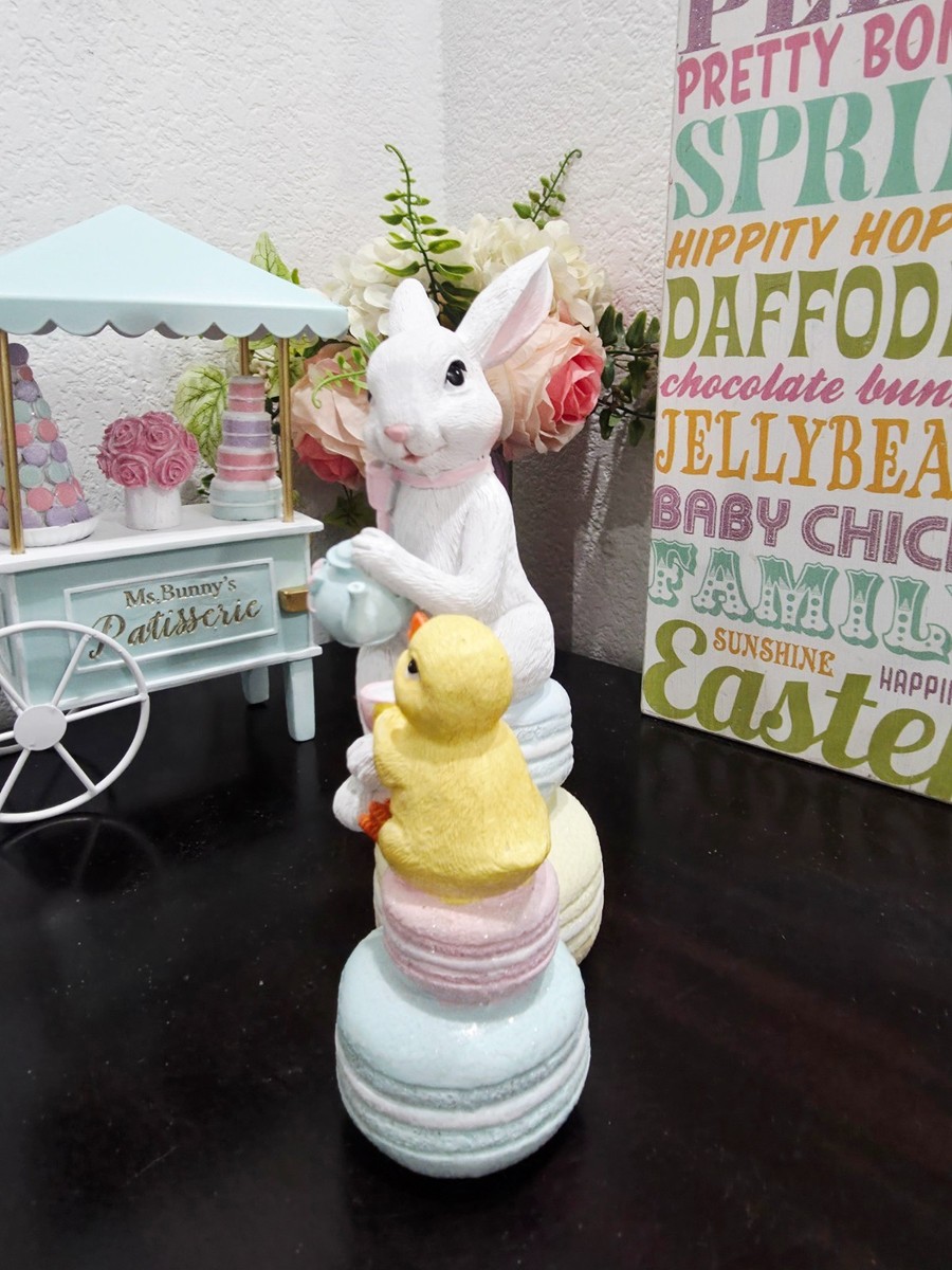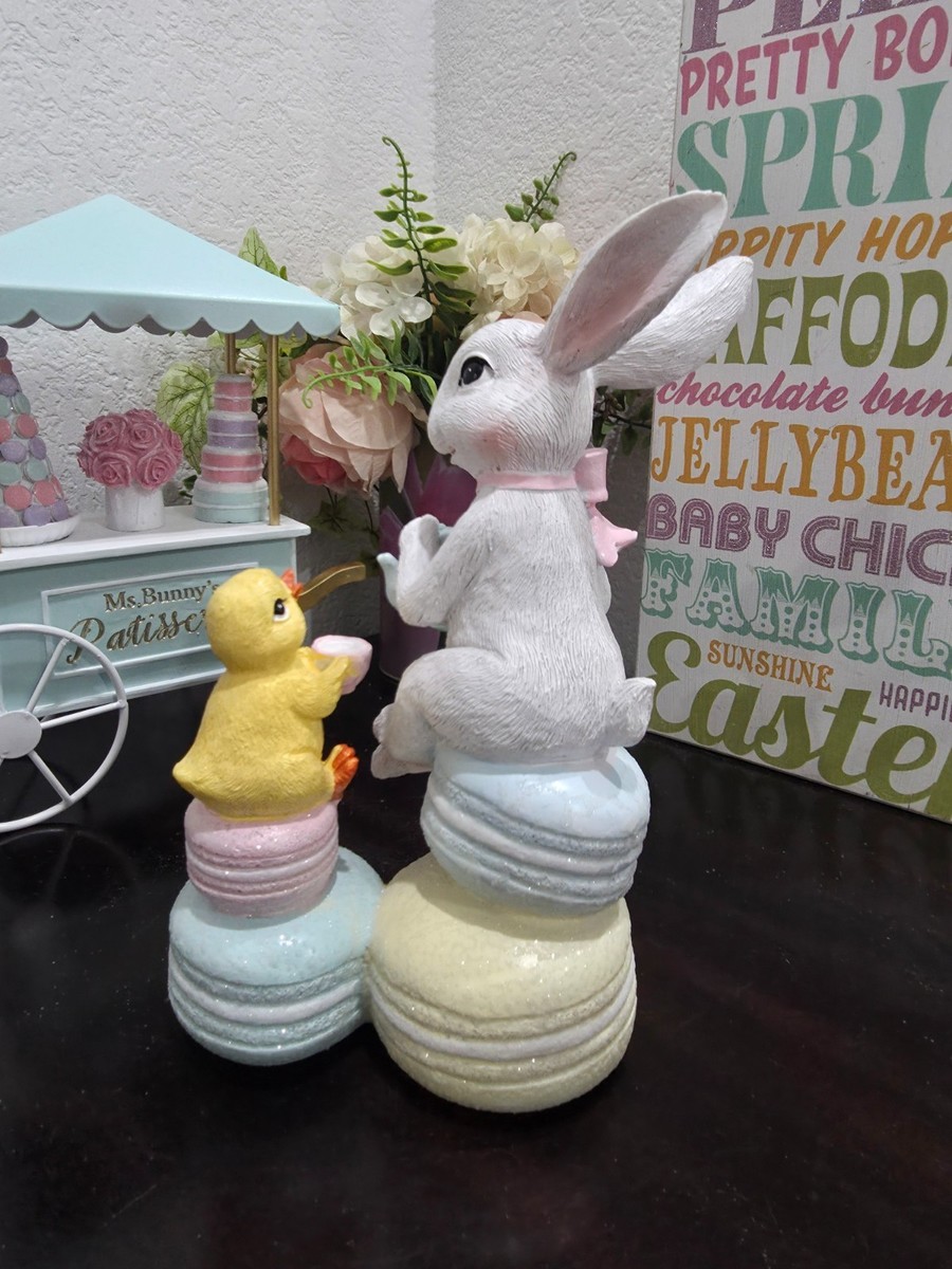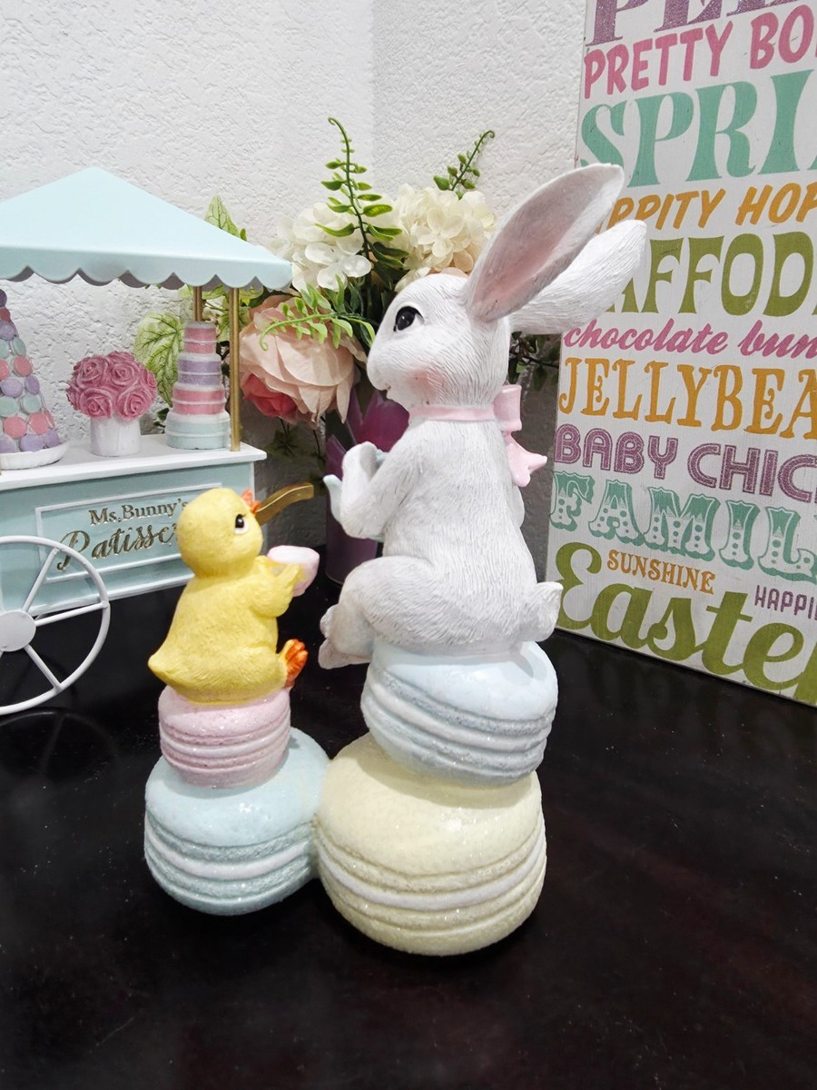 Easter Bunny Rabbit Sitting on Macarons Tea Party Chick Figurine Decor