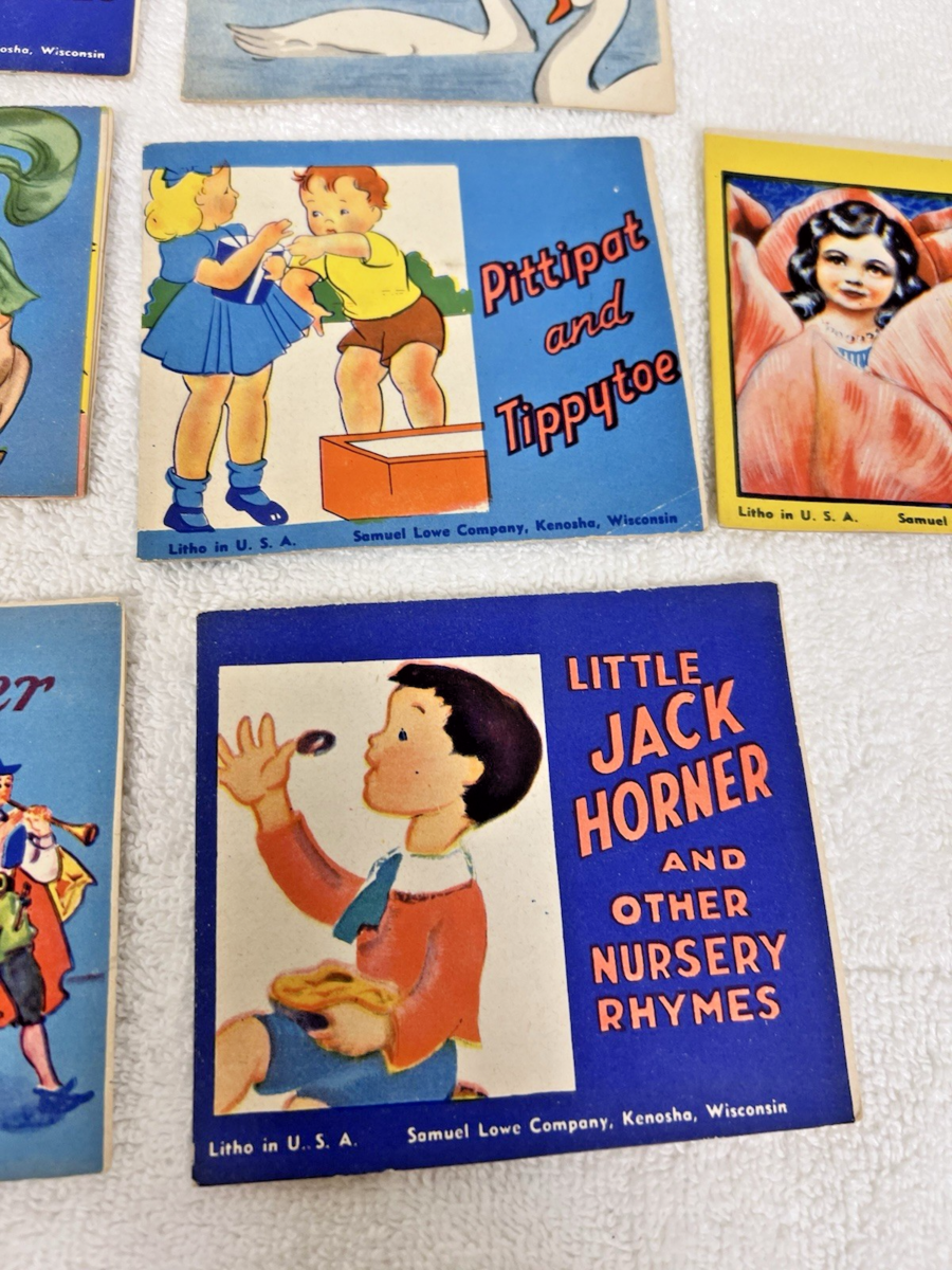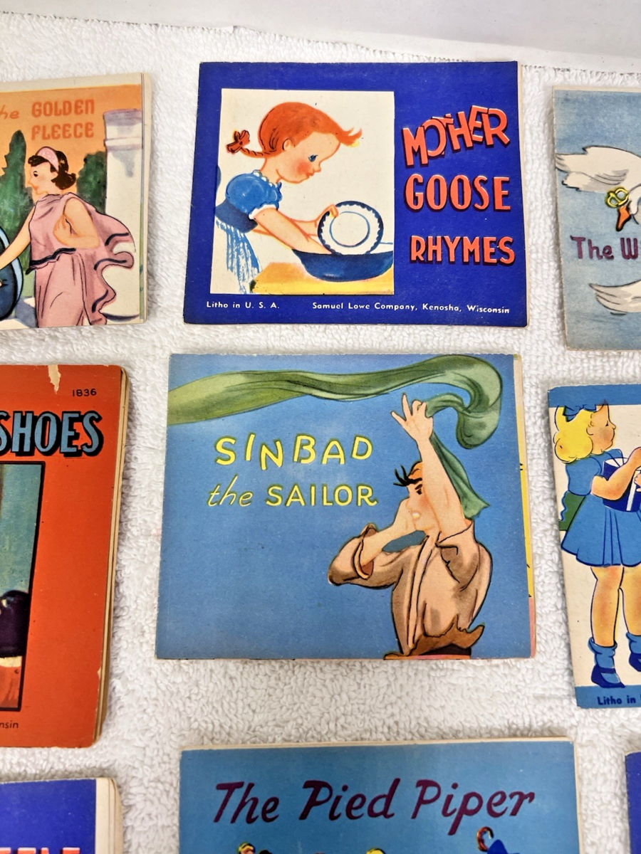 10 Vintage Miniature Childrens Books Samuel Lowe Poems Nursery Rhymes Fables Fairy Tales Mythology. Small lot of vintage children's books. 9 measure approx 3 1/2" by 4" and include titles: The Wild Swans, Mother Goos Rhymes, Pittipat and Tippytoe, The Golden Fleece, Little Jack Horner and other Nursery Rhymes, Little Poll Parrot Poems, The Pied Piper, The Story of Thumbelina, and Sinbad the Sailor - overall very good condition, one book has some lower corner wrinkling, no tears I see or stains. Little Poll book is not evenly cut but appears manufacturing issue. The Story of Goody Two Shoes 1836 measures approx 4" by 4" and has small tear top corner some bumping to corner edges. See pictures.