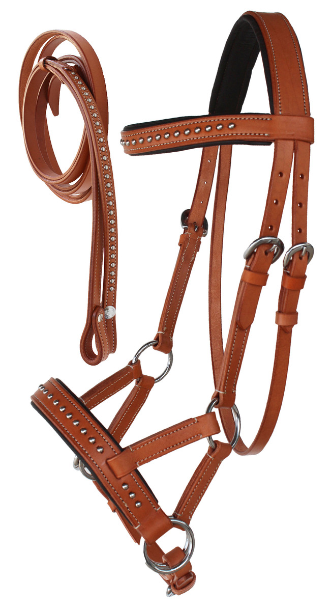 Horse Western Leather Training Tack Bitless Sidepull Bridle w/ Reins 7708TN-F