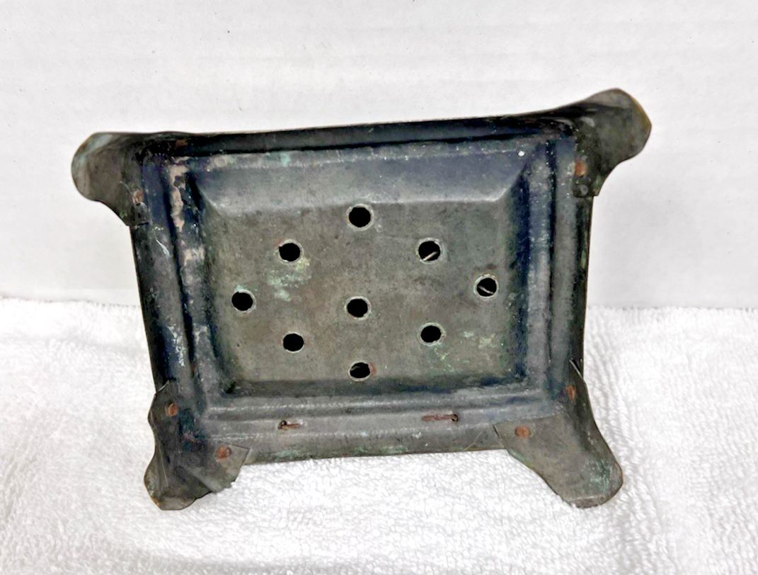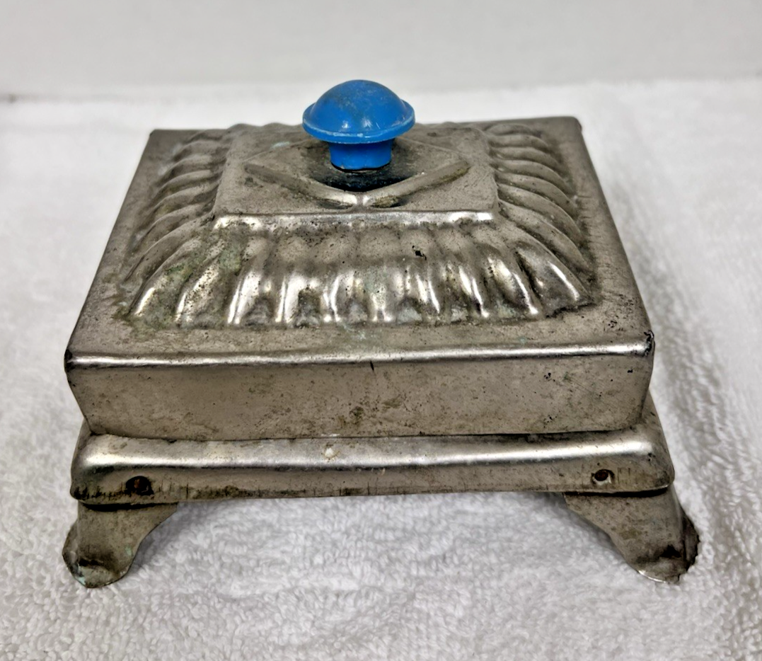 Vintage Pressed Metal Blue Knob Hinged Lid Footed Soap Dish 5" x 4 1/4" x 3 1/2"