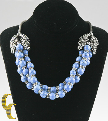 Unique antique silver finish featuring citron beads in royal blue turquoise with black diamond like crystals making this one beautiful long necklace