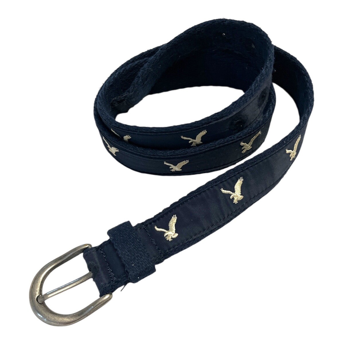 Y2K-era American Eagle Outfitters fabric belt in navy blue featuring repeating eagle motifs in contrasting light thread. This woven belt has a softly structured feel with stitched edges and a brushed silver-tone buckle. A classic early-2000s casual accessory with preppy and collegiate styling, ideal for jeans, cargos, or relaxed everyday looks.