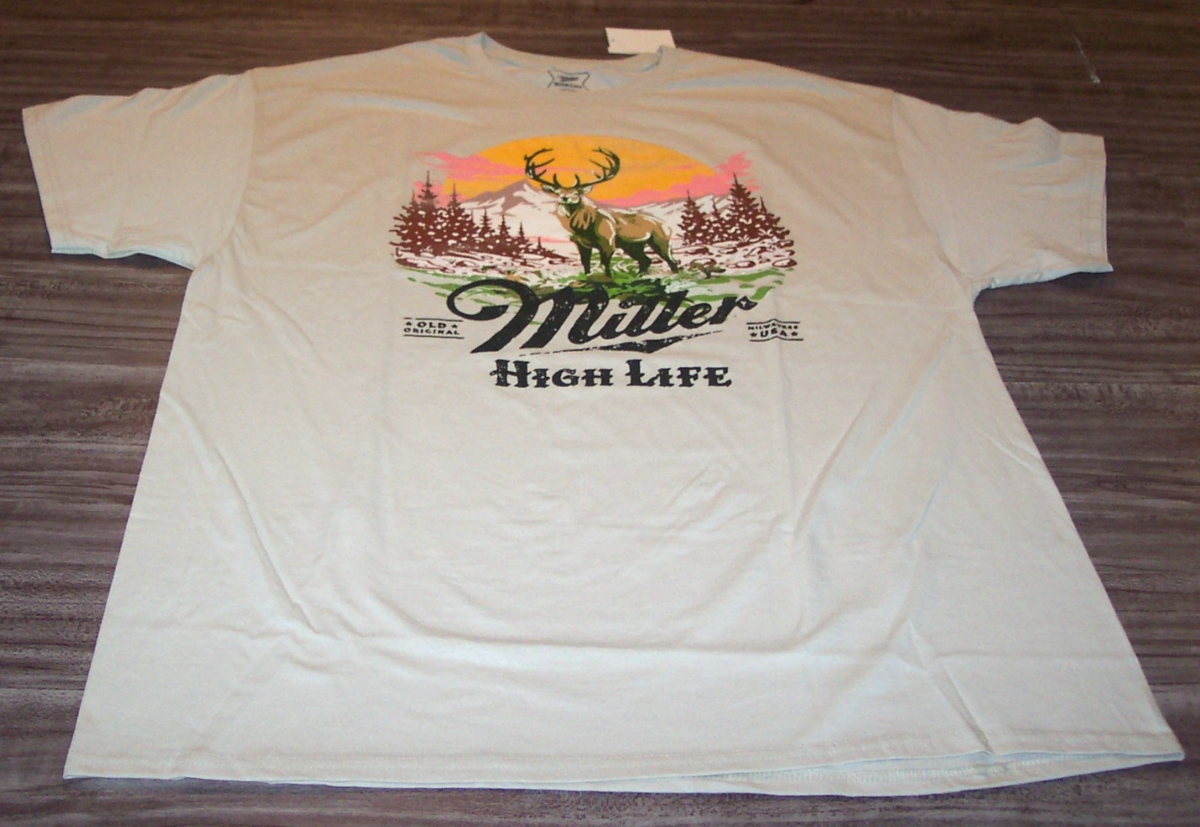 This is a VINTAGE STYLE MILLER HIGH LIFE BEER Mountains Deer T-shirt. It is a Size XL and is NEW with the tag. It is 24 inches from armpit to armpit and 31 inches in length. The print is made to look Vintage. Combine auctions to save on shipping. D2AD