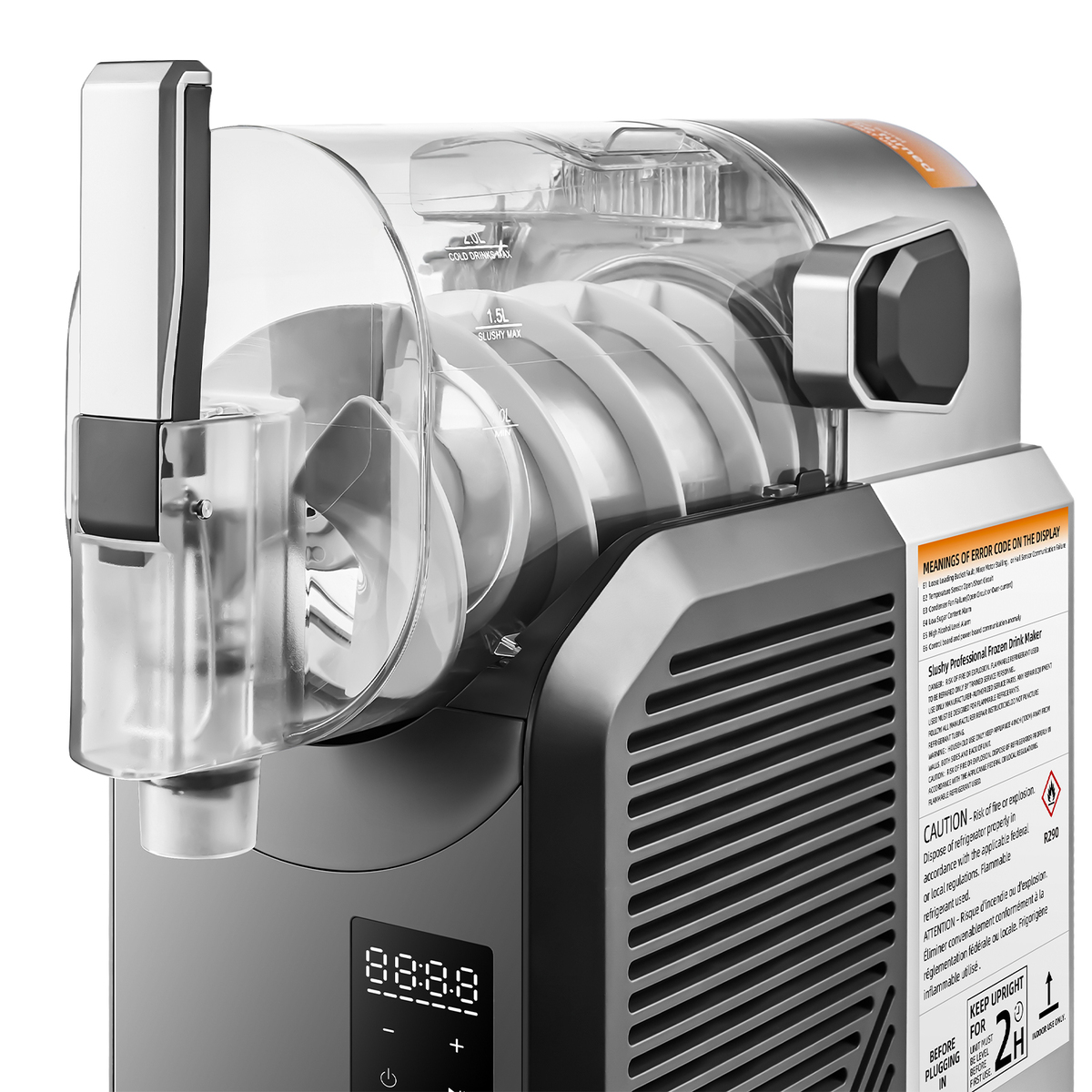 Slushy Machine for Home: Our slushy machine makes it easy to prepare a variety of alcoholic and non-alcoholic drinks, from margaritas to frozen fruit, milkshakes, and more. It comes with a recipe and is specifically designed for home users. The actual barrel capacity is 2L, while the 2L/68oz (cold drink) / 1.5L/50oz (slushy) mark on the barrel is the maximum recommended for filling liquid