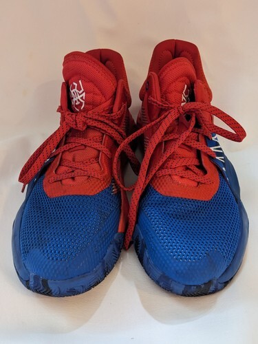 Step onto the court with these Adidas Spiderman Donovan Mitchell basketball shoes, inspired by Marvel's web-slinging superhero. The mid-top shoe shaft style and lace-up closure provide both support and comfort for players of all levels. The lightweight design is perfect for quick cuts and explosive jumps during games. These athletic shoes are part of the Adidas product line and feature a standard shoe width. The red and blue color scheme adds a pop of superhero flair to any basketball outfit. Whether you're a fan of Spiderman or just love high-quality basketball shoes, these Adidas Spiderman Donovan Mitchell basketball shoes are a must-have for any collection.