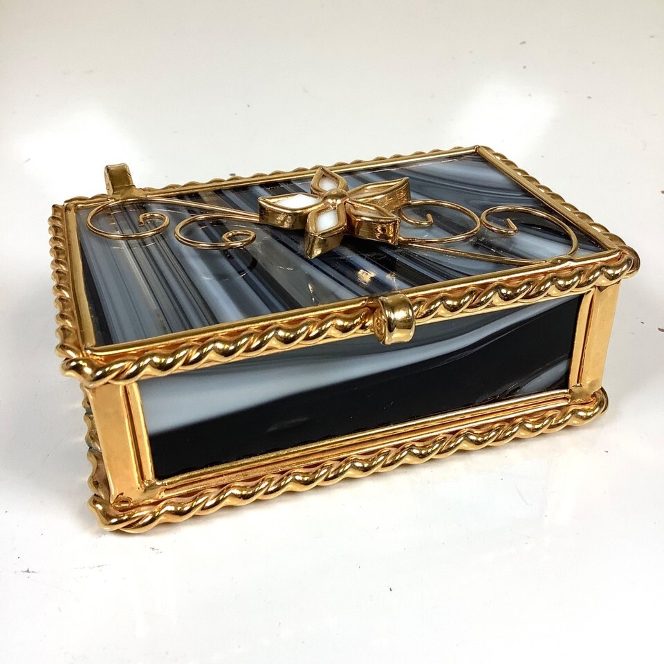 Agate Slag Glass 24k Gold Finish Heavy Trinket Jewelry Floral Box Hinged USA