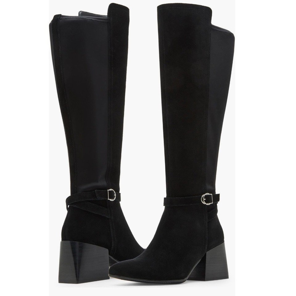 A dainty buckle strap at the ankle adds a refined finishing touch to this waterproof-suede knee-high boot with a stretch-to-fit inset in the shaft.