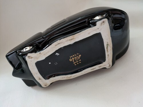 This vintage Hall China teapot is a unique addition to any collection. With a sleek automobile shape and glossy black finish, it is sure to catch the eye. Made in the United States in 1935, this antique teapot is a rare find for any tea enthusiast. Handmade with care instructions for hand washing only, this original piece is a beautiful representation of American art deco style. The backstamp is printed and the production technique is pottery. The teapot is unboxed and the packaging is not included. This vintage Hall China teapot is a must-have for any collector or lover of unique and beautiful pieces.