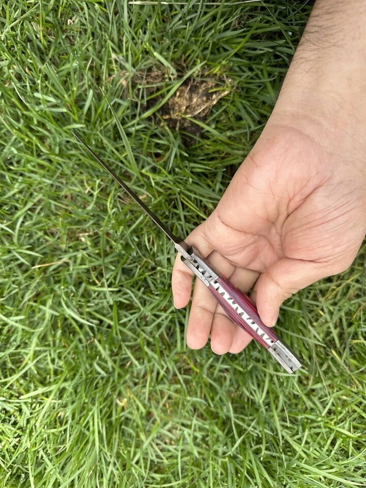 Blade of this knife has a nice file work and is made of 512 layers of 4340 stainless steel and 1075 high carbon steel and hardness 55-58 HRC .