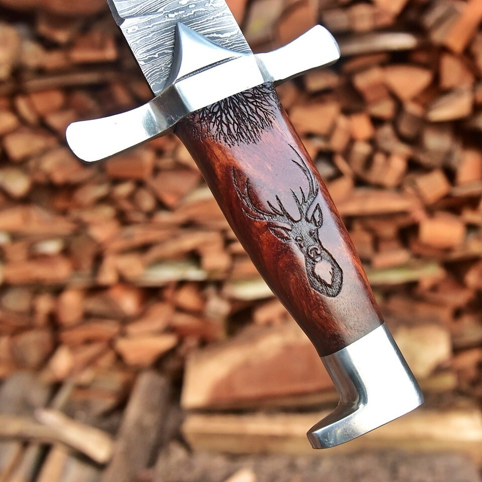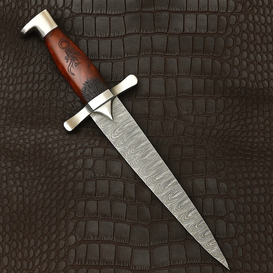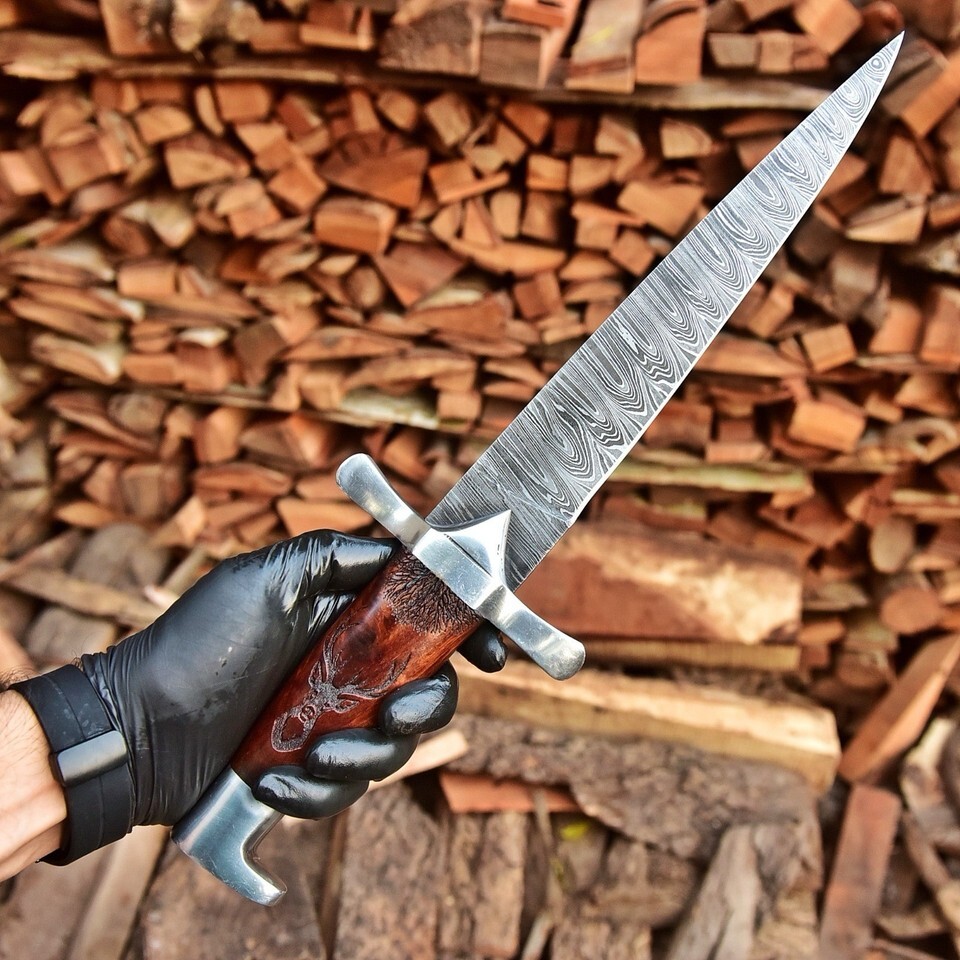 A handcrafted masterpiece inspired by ancient Roman and Viking designs ? this custom Damascus steel dagger combines historical aesthetics with modern craftsmanship. Featuring a 12-inch hand-forged Damascus steel blade and a 5.5-inch polished wood handle, it?s built for collectors, display, and enthusiasts who appreciate authentic handmade quality.