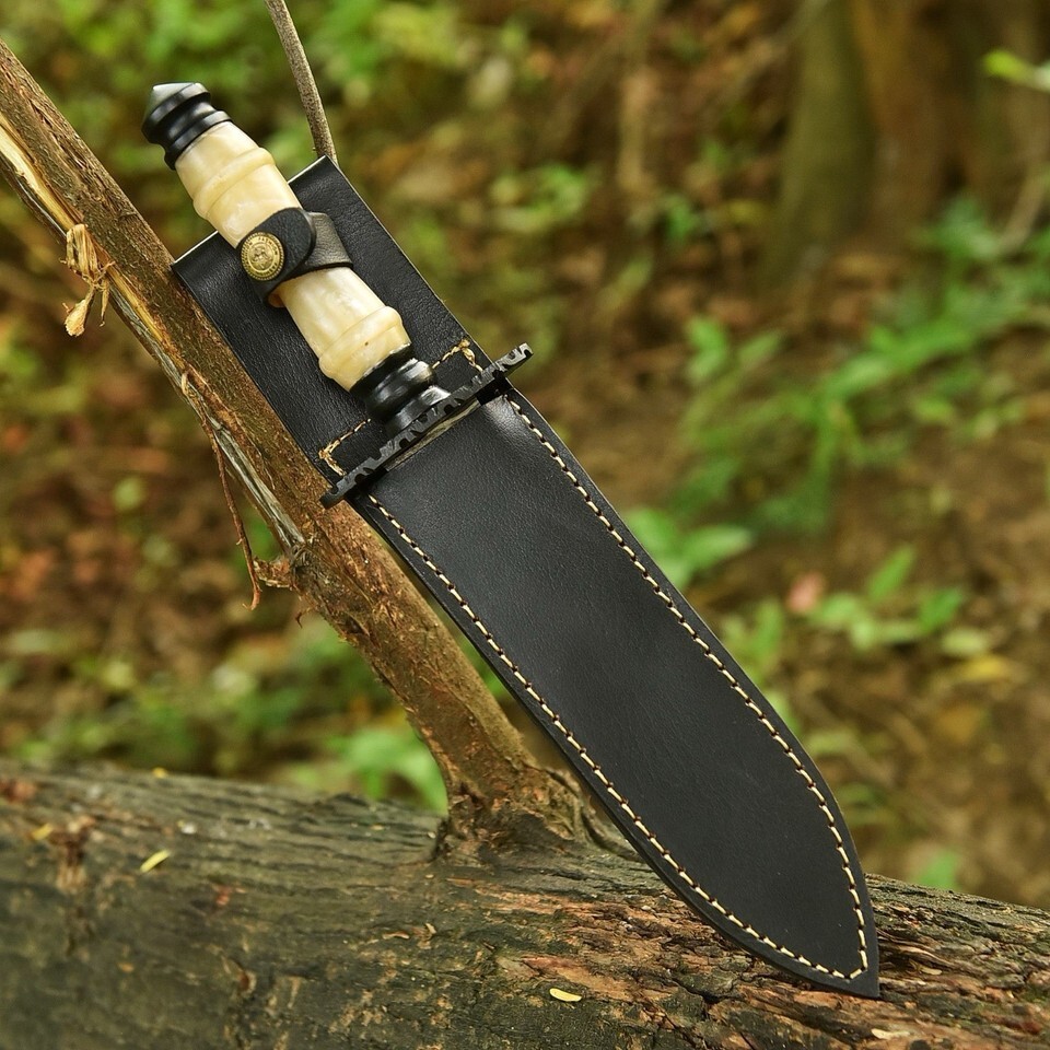 Thumb notches are cast into the handle above the guard to keep the knife from slipping when wet or wearing gloves. Sharp, double-edged Resin handle with cast thumb notches Includes custom leather sheath