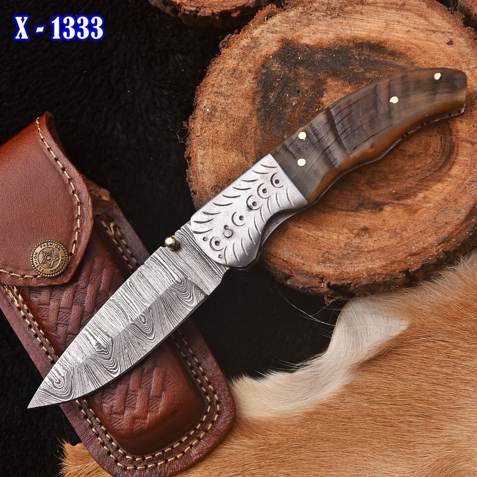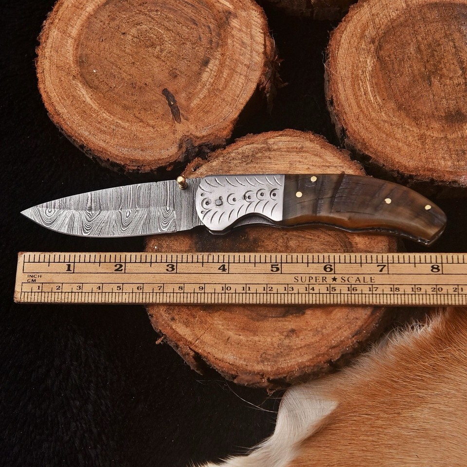 Damascus Folding Skinner Blade Pocket Knife Hunting Tactical Ram Horn Handle