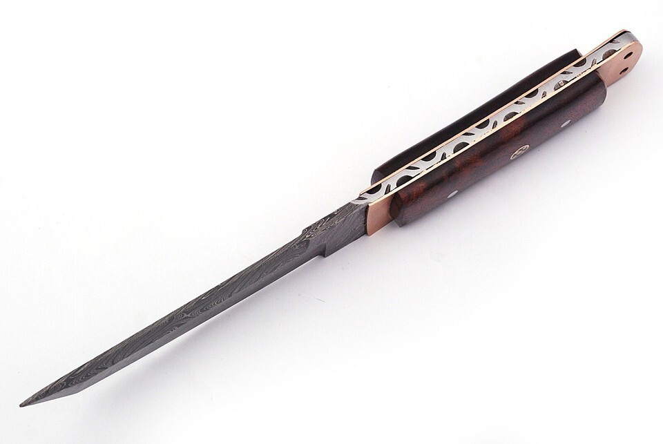 Blade of this knife has a nice file work and is made of 512 layers of 4340 stainless steel and 1075 high carbon steel and hardness 55-58 HRC .