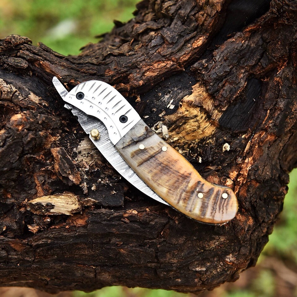 Vintage Damascus Folding Karambit Blade Pocket Knife Viking - Ram Horn Handle