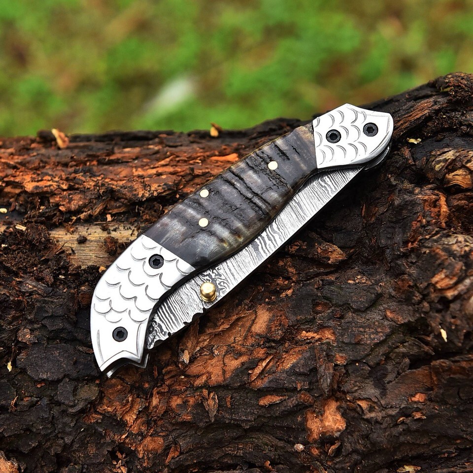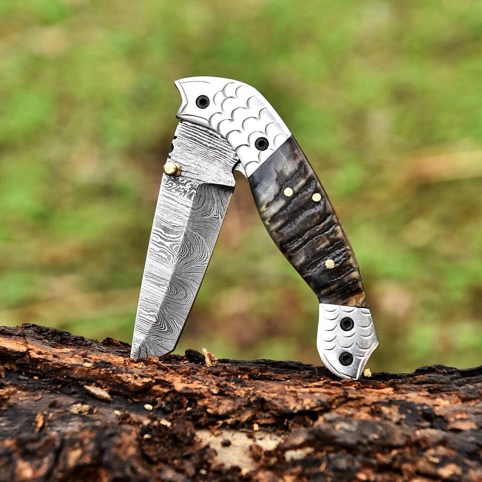 Damascus Folding Dagger Tanto Blade Pocket Knife Viking - Ram Horn Handle
