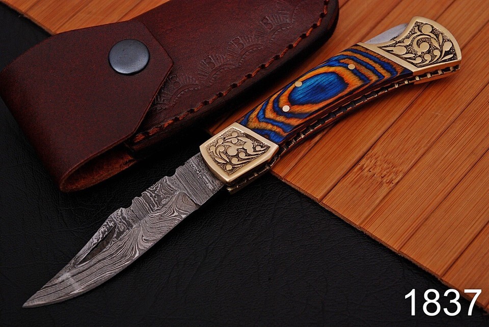 Damascus Steel Folding Blade Pocket Knife 7.5โ Wood Handle With Leather Sheath