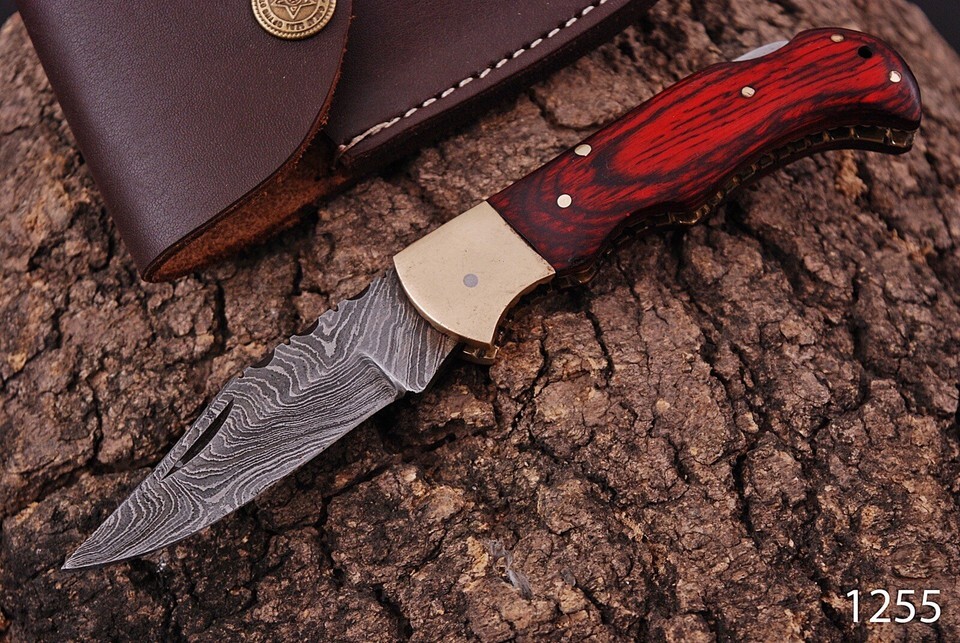 Damascus Steel Folding blade Pocket Knife wood Handle With Leather Sheath