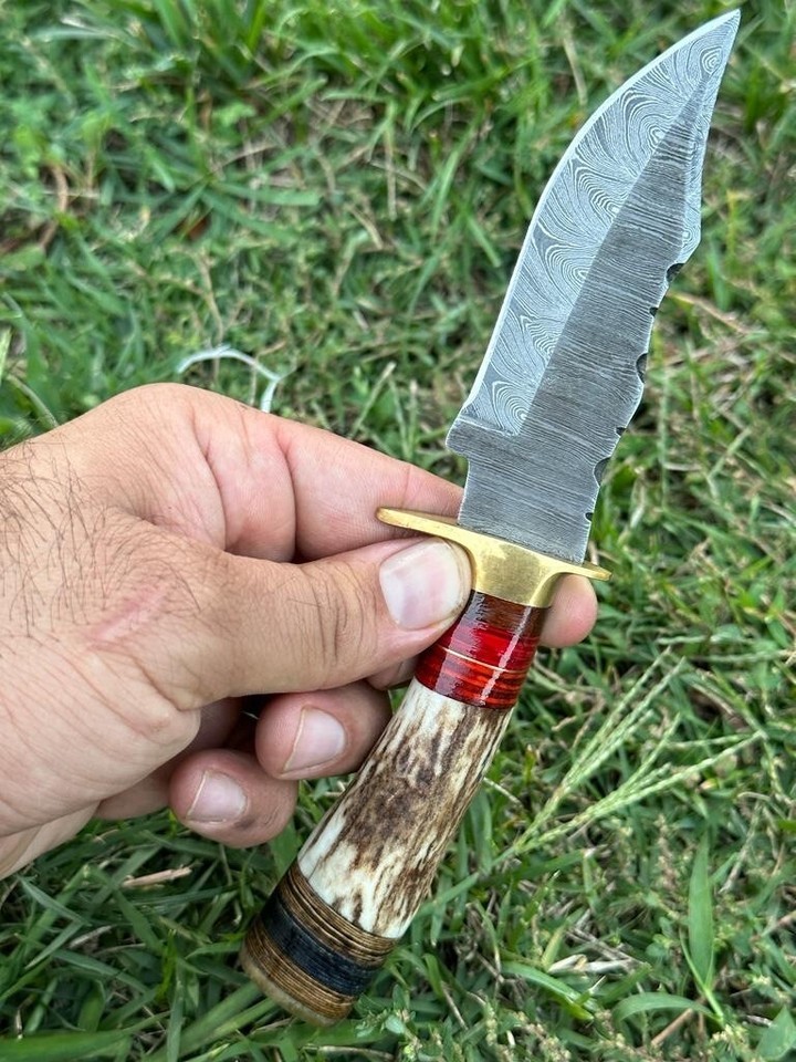 This 8-inch handmade Damascus steel knife is a perfect addition to your collection. With a full tang and ambidextrous dexterity, it is suitable for both left and right-handed individuals. The clip point blade is made of black and gray Damascus steel and features a plain edge. The handle is crafted from deer stag antler with a brass guard, making it both stylish and sturdy.