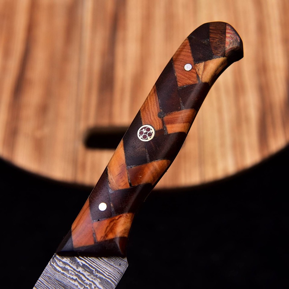 Blade of this knife has a nice file work and is made of 512 layers of 4340 stainless steel and 1075 high carbon steel and hardness 55-58 HRC . This robust knife is lab tested under intense conditions, the balance and shape of this knife ensures perfect grip.