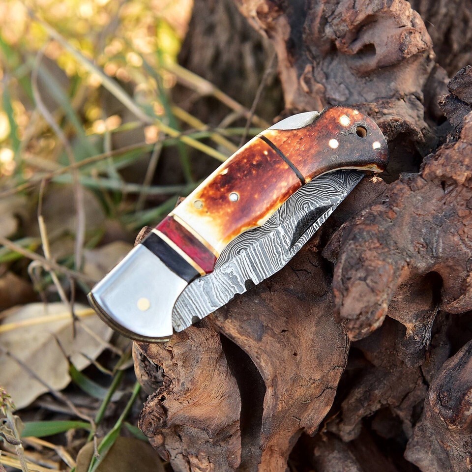 Pocket Knife Forged Damascus Folding Blade Knife Original Camel Bone Handle