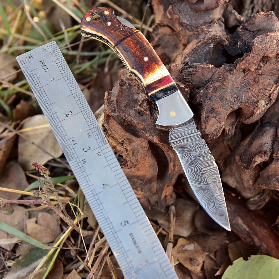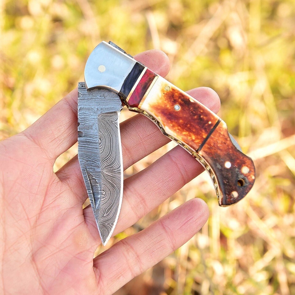 This custom handmade pocket knife is a great addition for hunting or camping. The blade is made of high-quality Damascus steel and features a clip point blade type with a plain edge. The tang is half and the blade length is 3 inches.