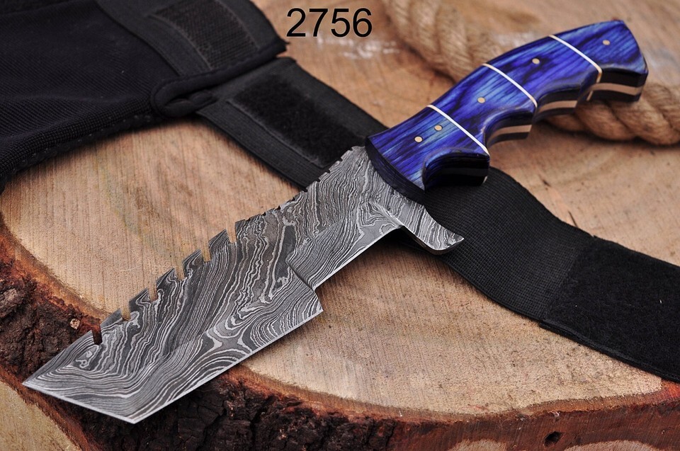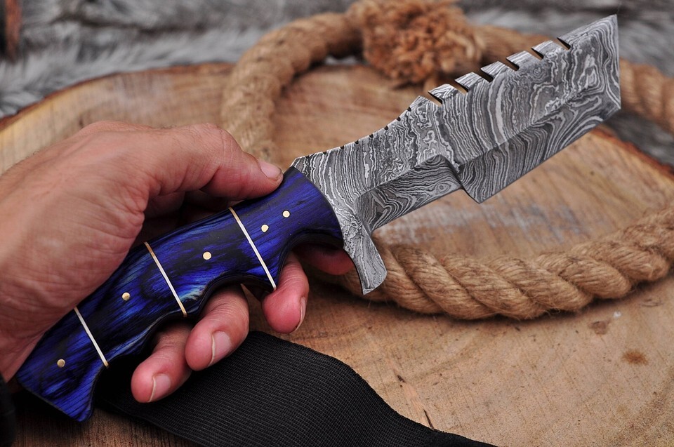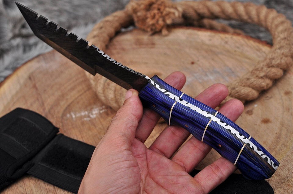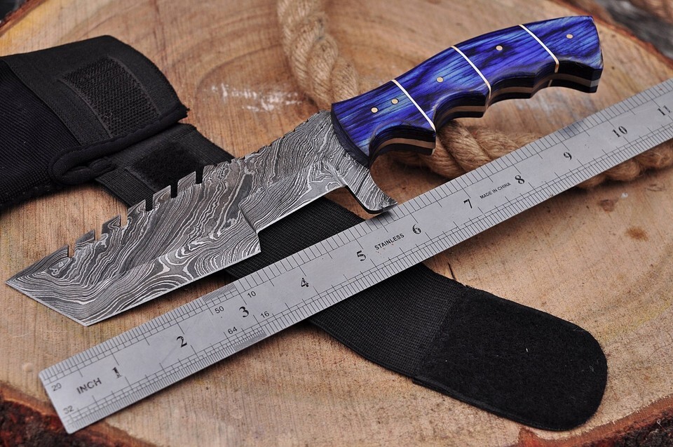 Blade of this knife has a nice file work and is made of 512 layers of 4340 stainless steel and 1075 high carbon steel and hardness 55-58 HRC . This robust knife is lab tested under intense conditions, the balance and shape of this knife ensures perfect grip.