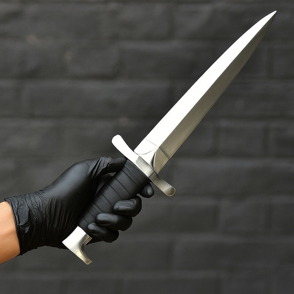 This is a custom-made dagger that combines classical Roman and Viking styling with modern tactical lines. The 12? carbon steel blade offers a bold silhouette and a mirror-like finish