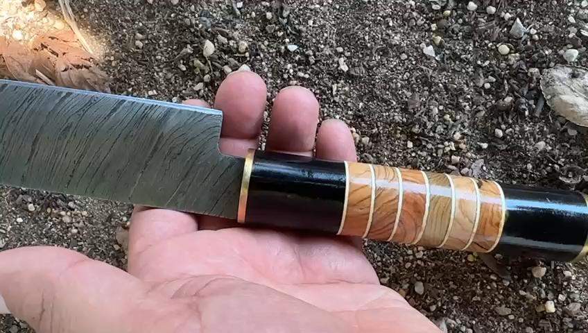 Blade of this knife has a nice file work and is made of 512 layers of 4340 stainless steel and 1075 high carbon steel and hardness 55-58 HRC .