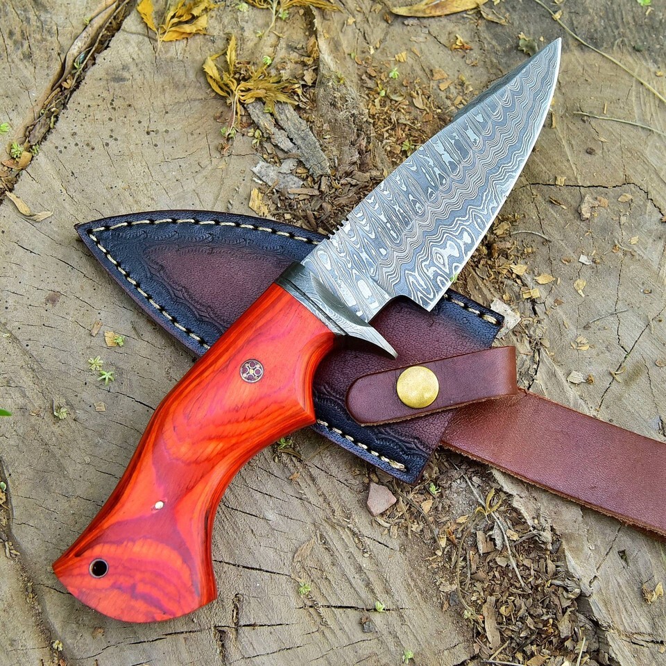 Handmade Damascus Fixed Blade Bowie knife Red Wood Handle with leather Sheath