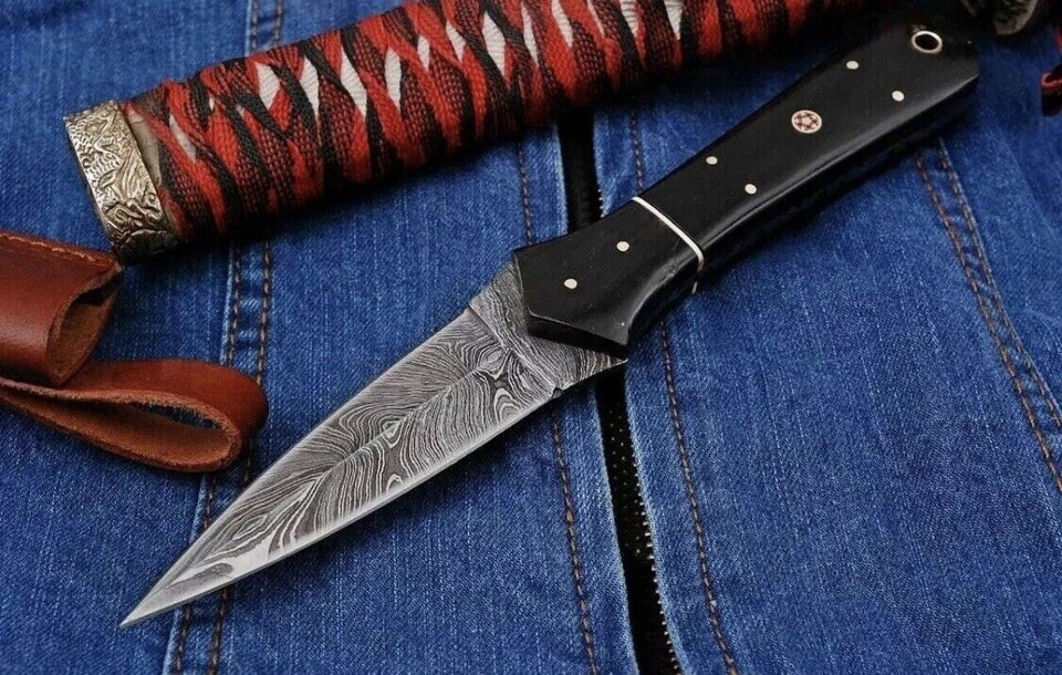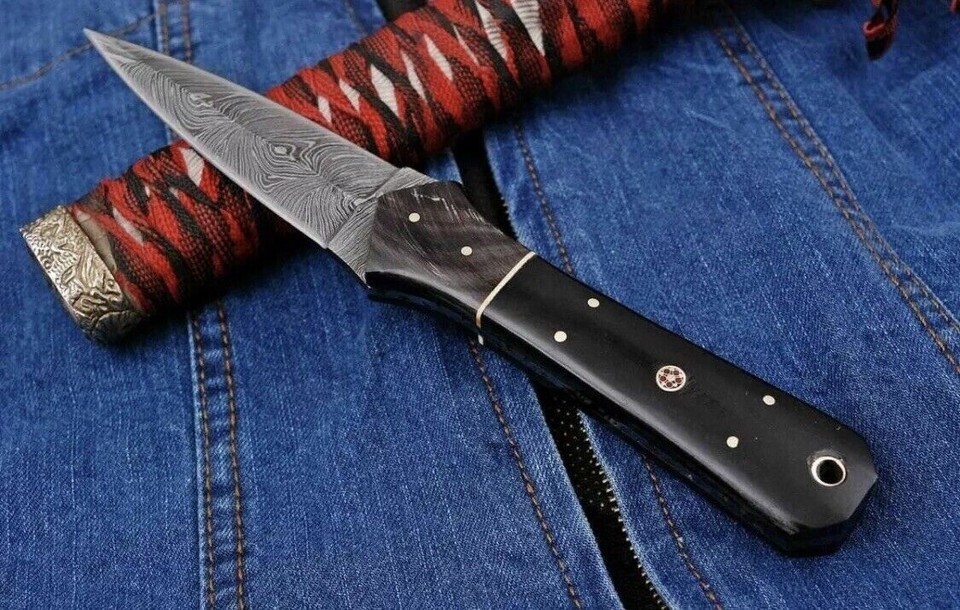 FORGED DAMASCUS STEEL DOUBLE EDGE BLADE THROWING BOOT DAGGER HUNTING CAMPING KNIFE