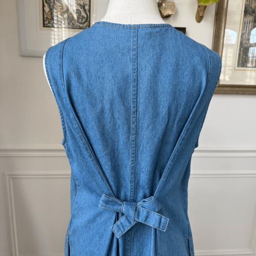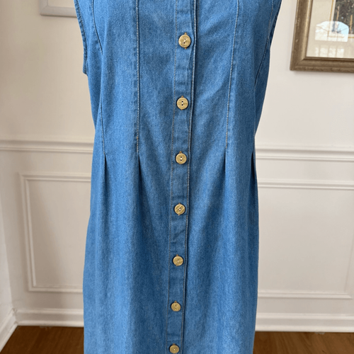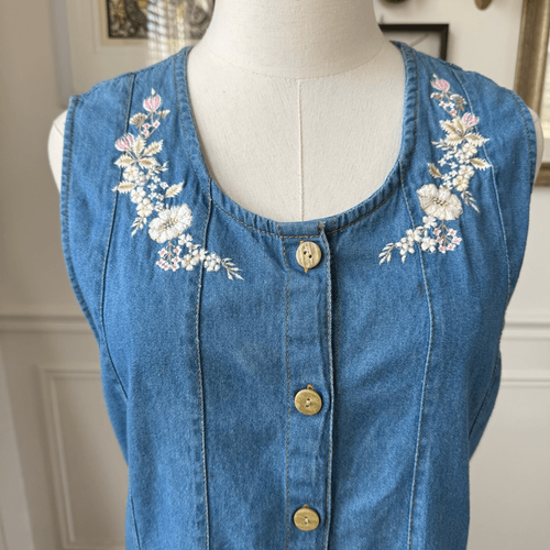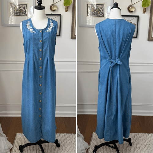 Vintage 90s 220 Hickory by Blain 100% cotton chambray sleeveless dress. Button in front with tabs in the back that tie for a little waist definition. There is also some princess seeming that releases at the waist that gives the same effect. Embroidered around the neck in ivory, pesto, green, and pink flowers. Laying flat measures 47 inches shoulder to him, 21 inches armpit to armpit and 21.5 inches straight across the waist. That is untied. The size says MED PT but I find it hard to believe the PT means petite because at 5?6? tall it is maxi length on me. So please double check measurements to ensure the proper fit for you.