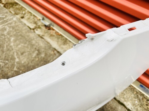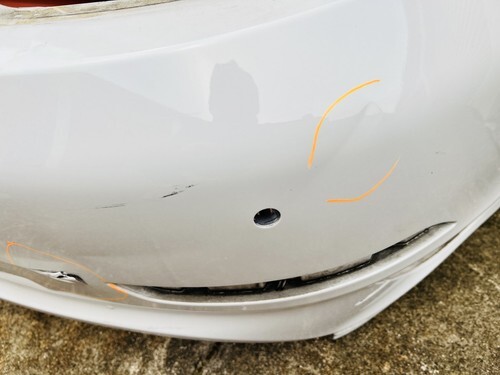 BUMPER HAS SOME DAMAGE ON THE RIGHT SIDE CUT. CLIP ON TOP IS BROKEN . SEE PICTURES