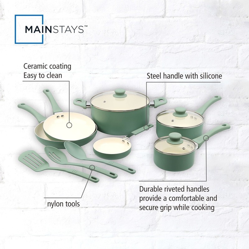Ideal for everyday use at home, this Mainstays ceramic 12 pieces set green sage includes pans and kitchen utensils that can fulfill your everyday cooking needs at home. It is also ideal as a considerate and valuable gift to your close friends and family. The interior is coated with 2 layers of PPG Customized ceramic coating, which makes cooking and clean-up easy. The pans heat quickly and evenly due to the aluminum body, so this set will help you save time cooking as well. Cool, soft-touch handles provide a comfortable grip, while the outside color of this set will offer a bright pop of color to your kitchen.