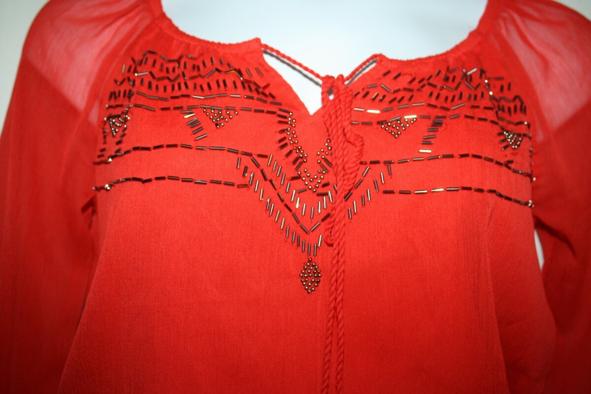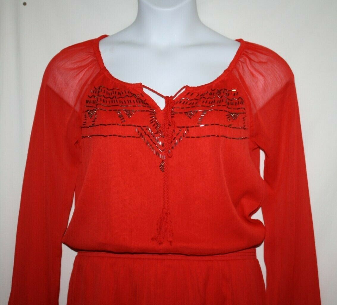 Jessica Simpson, Misses, MEDIUM, Red Georgette Beaded Chest Blouson, Sheer Sleeves Party Dress, Drawstring Neckline, Smocked Elastic Waist