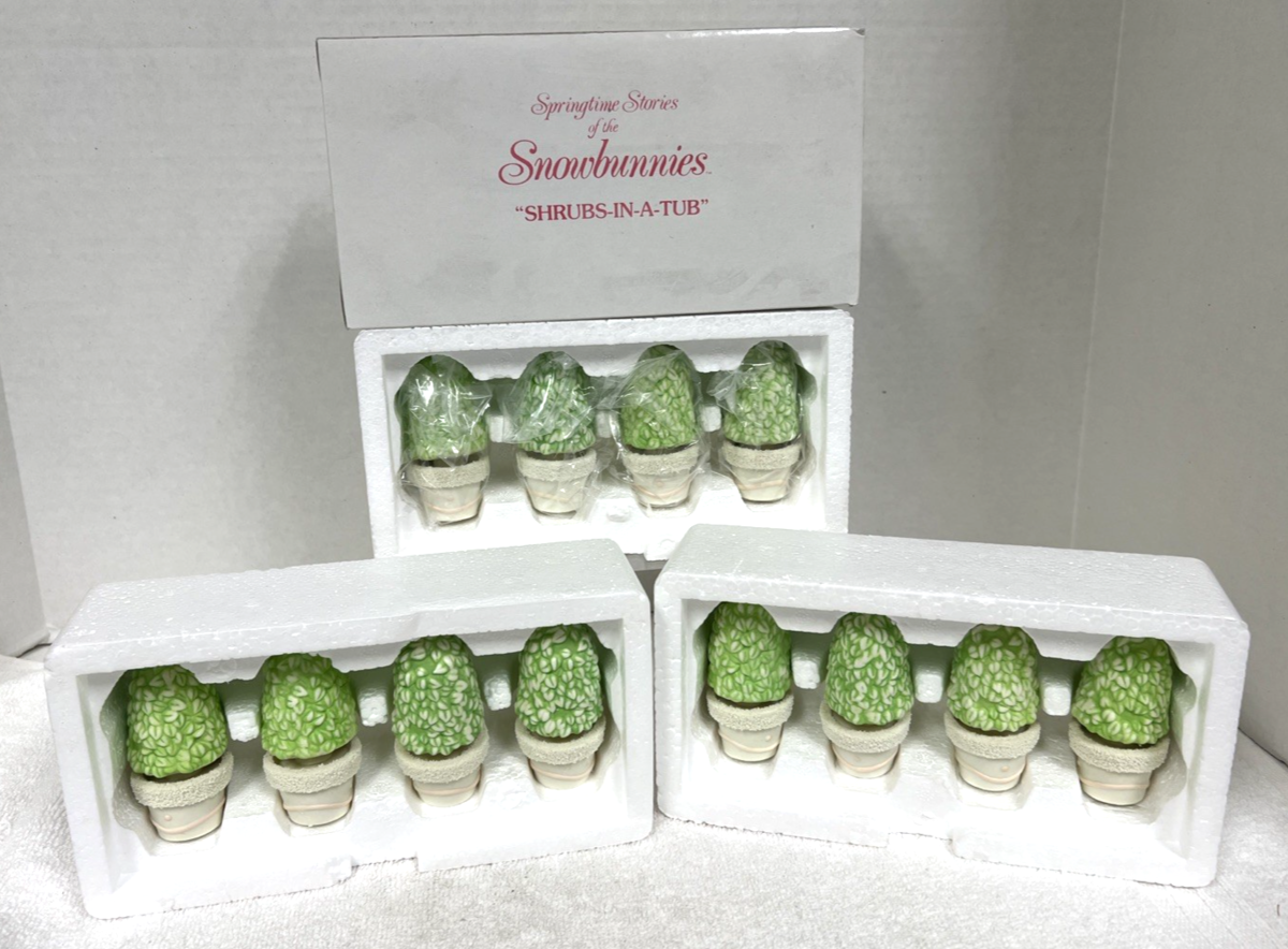 1990's Snowbunnies Shrubs in a Tub In Orig Box Dept 56 Easter Spring 3 Sets about 3 inches tall in great shape in great shape with the box is a bit dirty