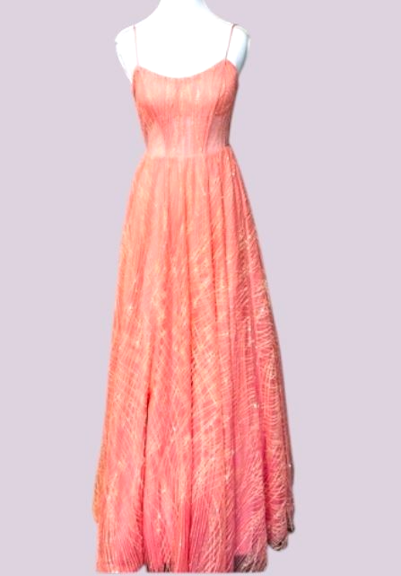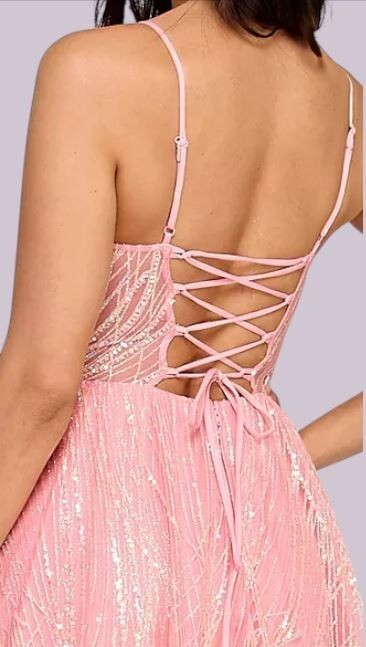 This dreamy Say Yes gown delivers full fairy?tale sparkle with a modern, youthful twist. The illusion front bodice adds a delicate, ethereal touch while providing elegant coverage. A lace?up back enhances the fit and adds a romantic, corset?inspired detail. The entire gown shimmers with glitter accents, catching the light beautifully from every angle. The flowing blush?pink skirt creates soft movement, making it perfect for prom, formal dances, or any special occasion where you want to shine.
