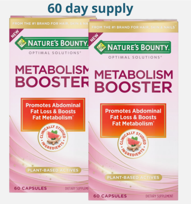 2 boxes Expiration Date of 9/2026 ? METABOLISM SUPPORT WITH PLANT-BASED ACTIVES: Nature?s Bounty Optimal Solutions Metabolism Booster is a 100% drug-free supplement designed to promote abdominal fat loss and boost fat metabolism (1) ? BOOST FAT METABOLISM WITH CITRUS EXTRACTS: A clinically studied blend of citrus extracts including Orange and Grapefruit helps to boost fat metabolism and reduce waist circumference (1) ? PLUS BLACK GINGER EXTRACT: Black Ginger is a clinically studied ingredient shown to promote abdominal fat loss (1) ? SAFE FOR DAILY USE: These 100% drug-free capsules are a safe way to help manage your weight along with a healthy diet and exercise program (1) ? FROM THE TRUSTED WELLNESS EXPERTS: Nature?s Bounty Optimal Solutions Metabolism Booster is a product of 50 years of dedication to quality and scientific research to make excellent vitamins and nutritional supplements