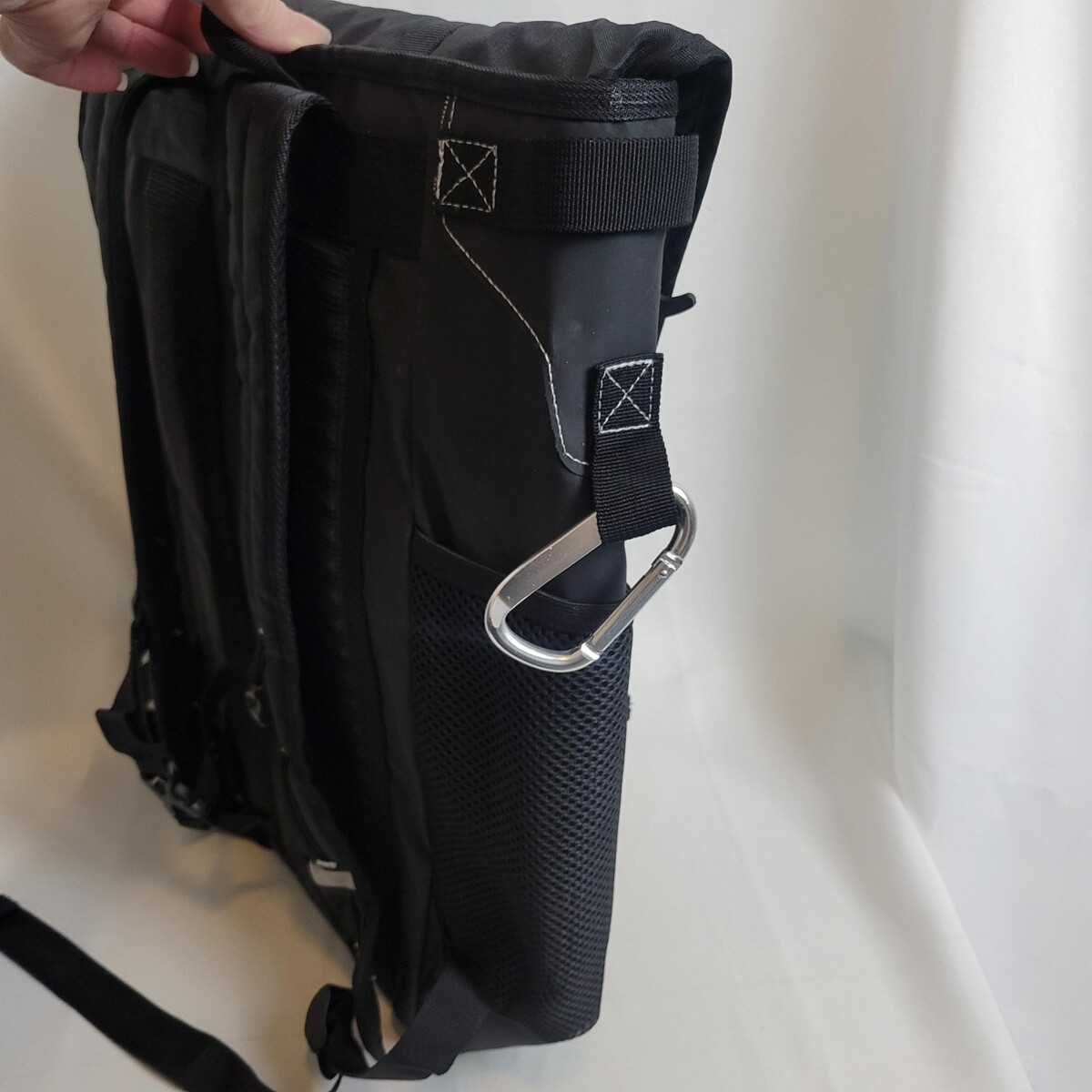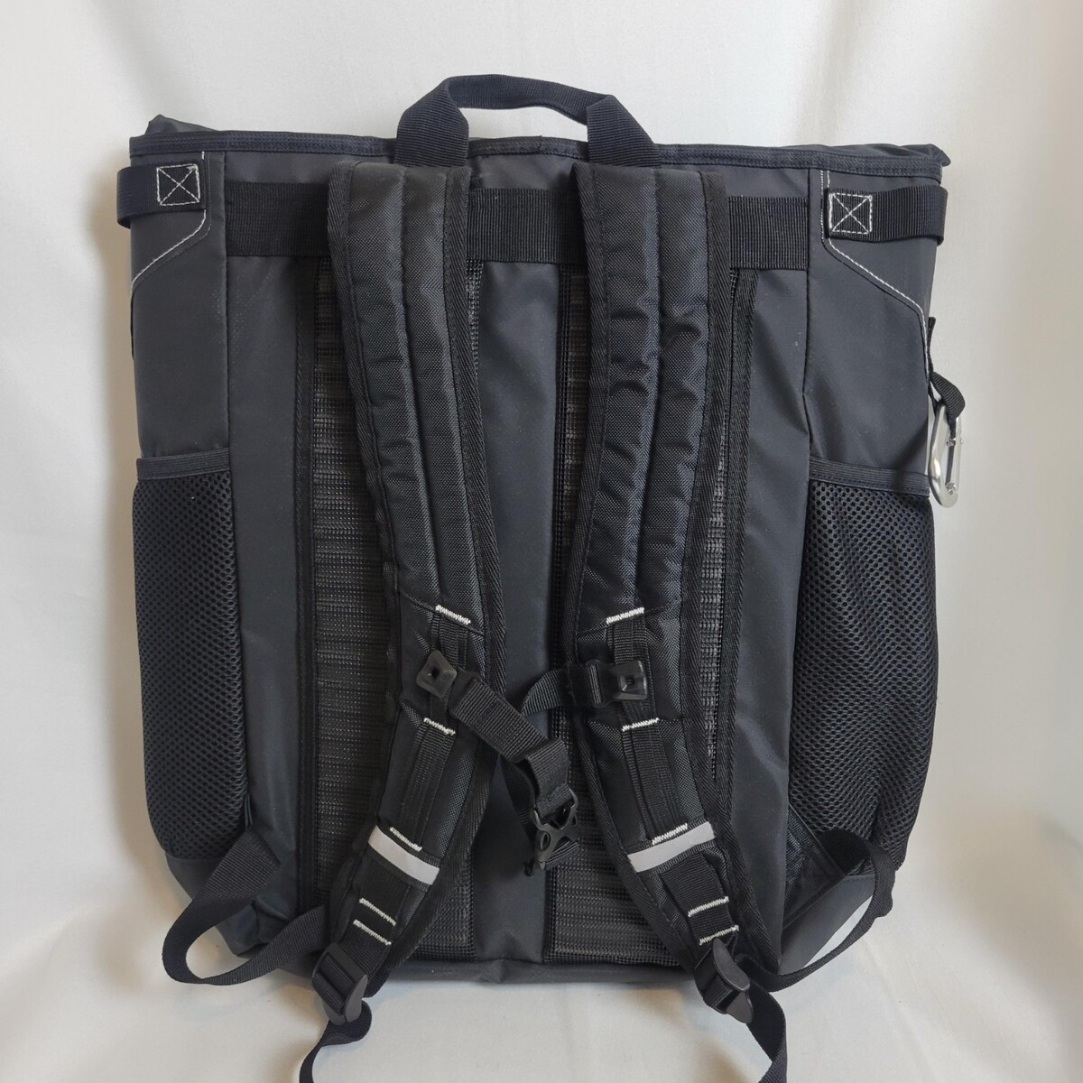 Should hold 24 cans. Adjustable straps. Mesh side pockets. Bottle opener. Carabiner.