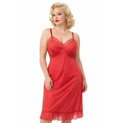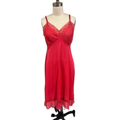 What you?ll love about this Luxite Holeproof full slip is the unmistakable glamour of true 1950s lingerie?liquid-smooth nylon, a sculpting lace bodice, and that dreamy sheer pleated hem that moves beautifully with every step. The color is a rich warm rosy red that reads sultry yet elegant, perfect for both wear and display.