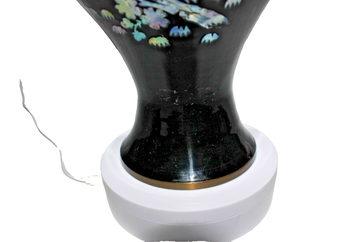 Vintage Black Lacquer Vase with Mother of Pearl Floral Bird Inlay 14" T X 8" W