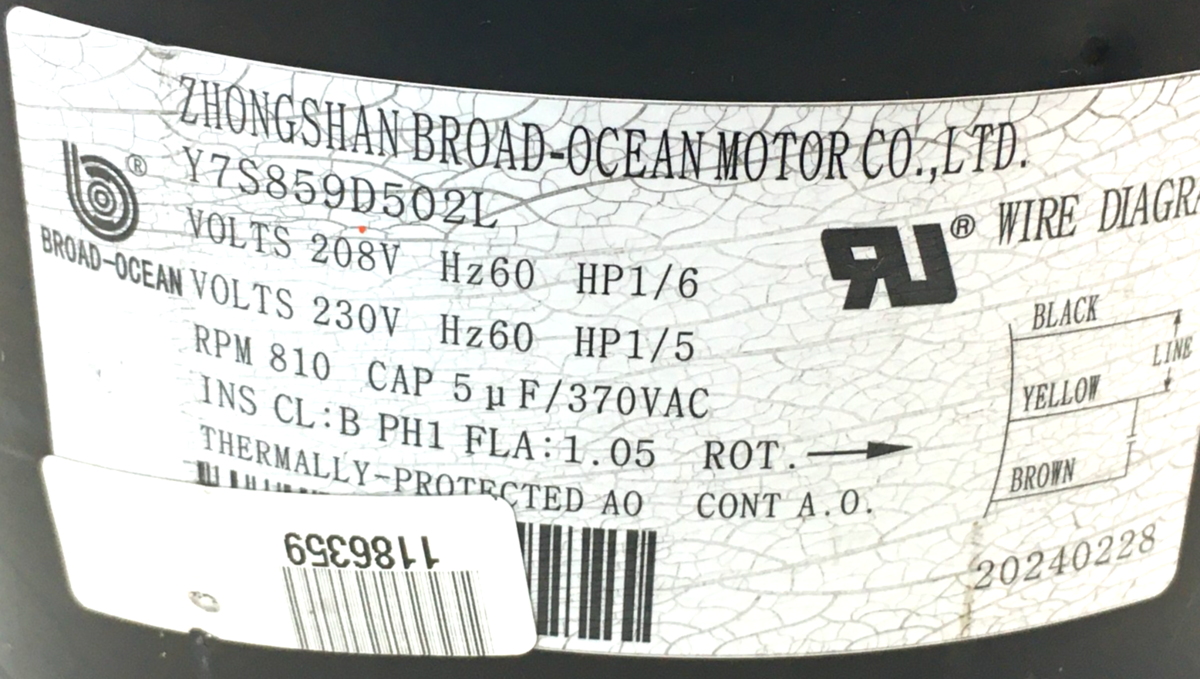 This is Broad-Ocean Y7S859D502L Condenser Motor 1/6 HP 208-230V 810 RPM ICP 1186359 used part.