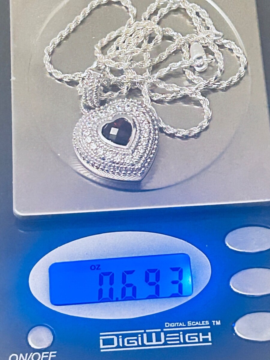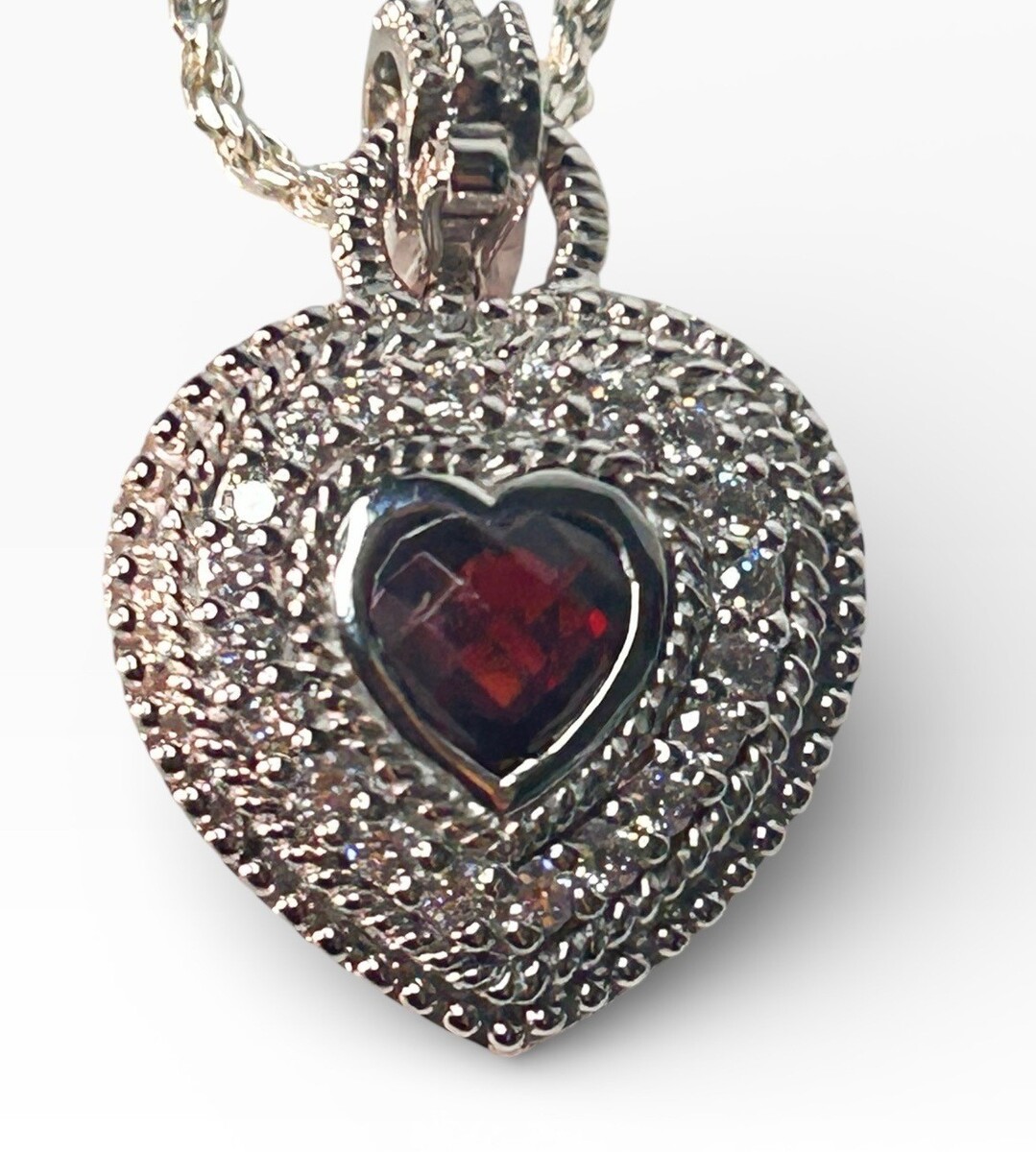 This Judith Ripka necklace features a stunning heart shaped pendant with an authentic Garnet gemstone surrounded by sparkling stones and set in Sterling Silver. This heart symbolizes love and devotion. This listing also includes the beautiful Sterling Silver chain seen in images that complements the pendant. (When comparing this listing with others, keep in mind that many listings are for just the pendant). This chain adds elegance and convenience, making this lovely necklace ready to wear, thereby making it an ideal gift for any occasion including Valentine's Day, Anniversaries, Christmas or Birthdays...or as a gift to yourself for some special milestone or occasion.