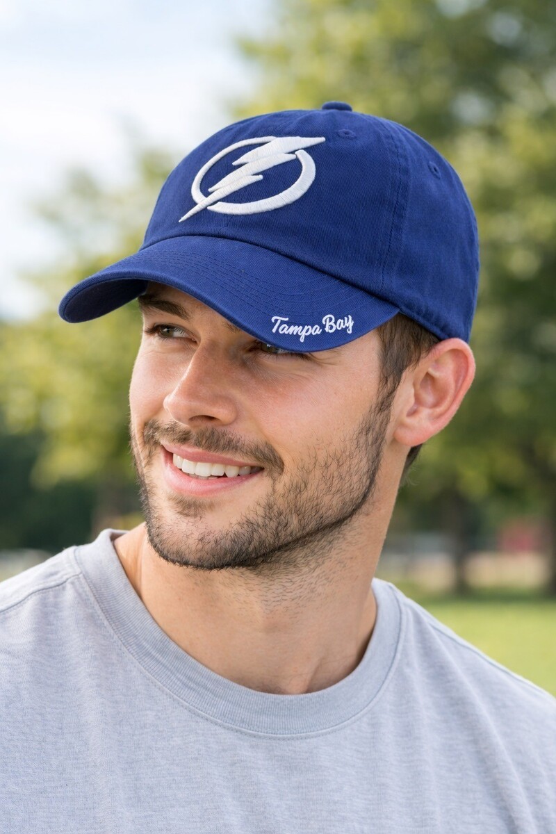 Officially licensed Tampa Bay Lightning baseball cap by Zephyr. This classic navy blue dad hat features an embroidered Lightning bolt logo on the front and ?Tampa Bay? stitched on the side of the brim. Made from 100% cotton with a relaxed fit and adjustable back strap, it?s an easy everyday cap for fans and collectors alike.