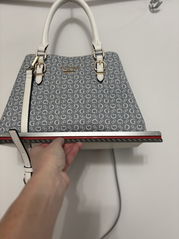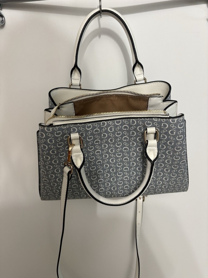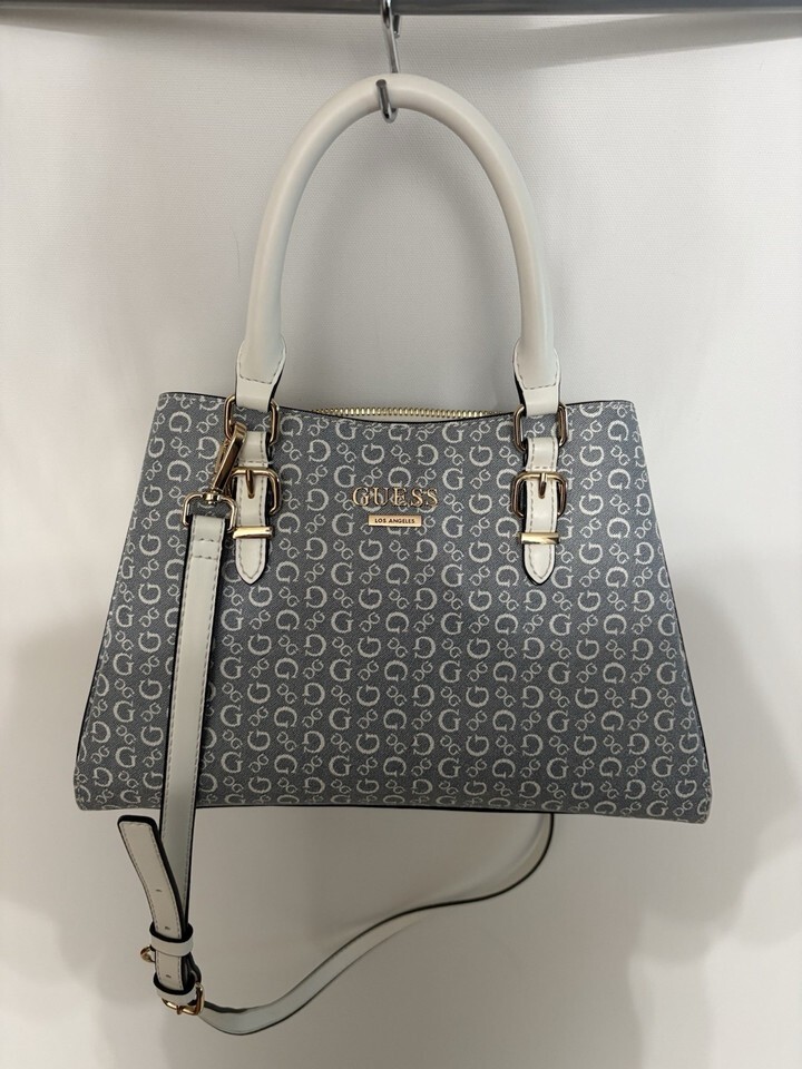 The Guess Denim Logo Satchel Handbag with Matching Wallet is a stylish and practical accessory for women. Featuring a large size and a white exterior color with a silver logo pattern, this handbag is made of faux leather material. The beige handle/strap, gray lining, and inner pockets and dividers add functionality to this satchel/top handle bag, making it perfect for everyday use. The sleek and modern design of this handbag and wallet set is sure to elevate any outfit.